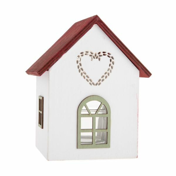 Vytvořte kouzelnou vánoční atmosféru s tímto dřevěným svícnem ve tvaru domku. Domek má bílé zdi a červenou střechu, z čelní strany velké okno a z každého boku jedno okno. Ve štítu domku je velké srdíčko.Uvnitř domku je umístěna skleněná vložka na svíčku, přístupná ze zadní strany, díky které lze bezpečně a snadno umístit čajovou svíčku nebo LED svíčku. Kompaktní design a detailní zpracování z něj činí ideální dekoraci na stůl, parapet či poličku.