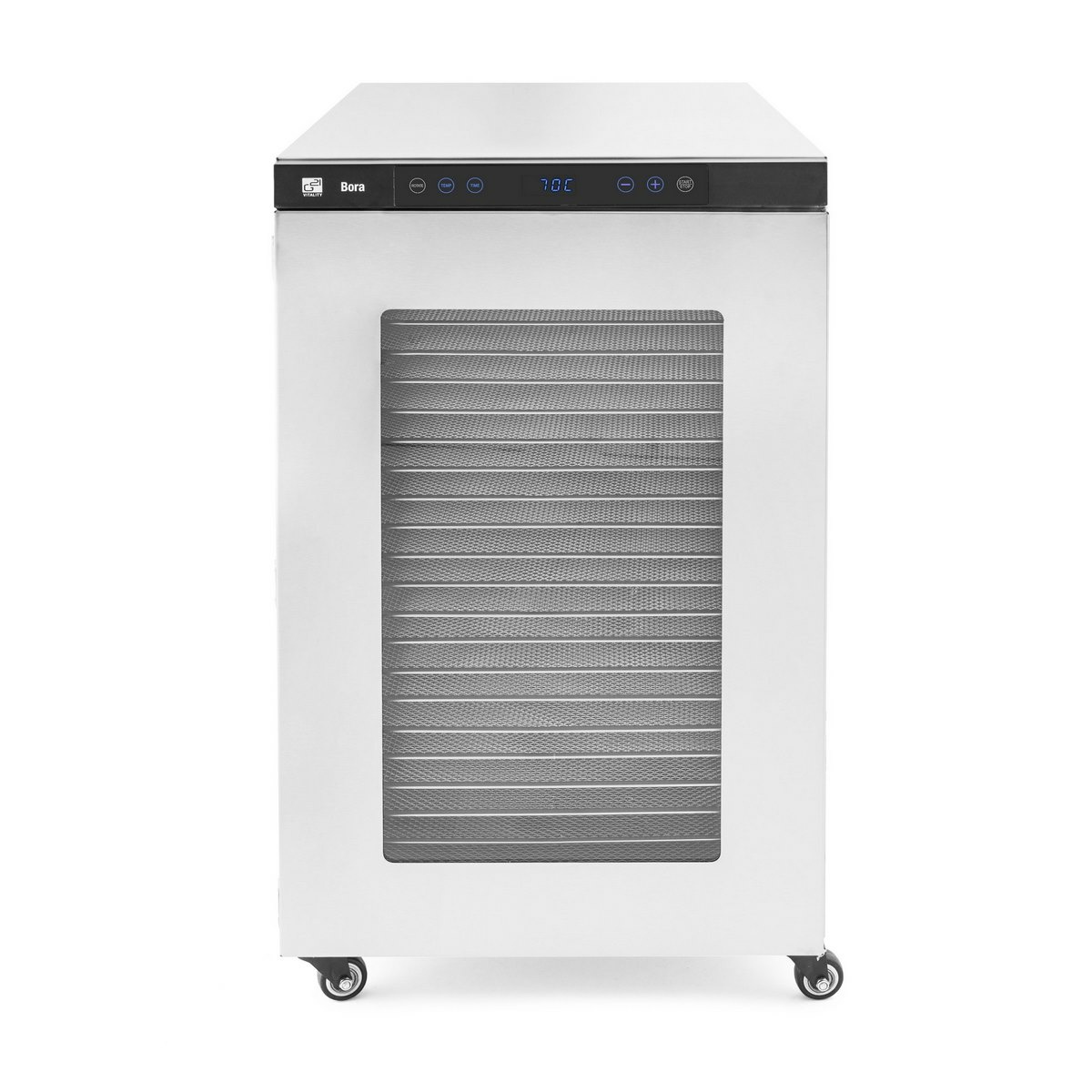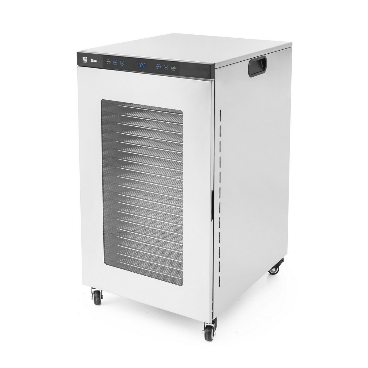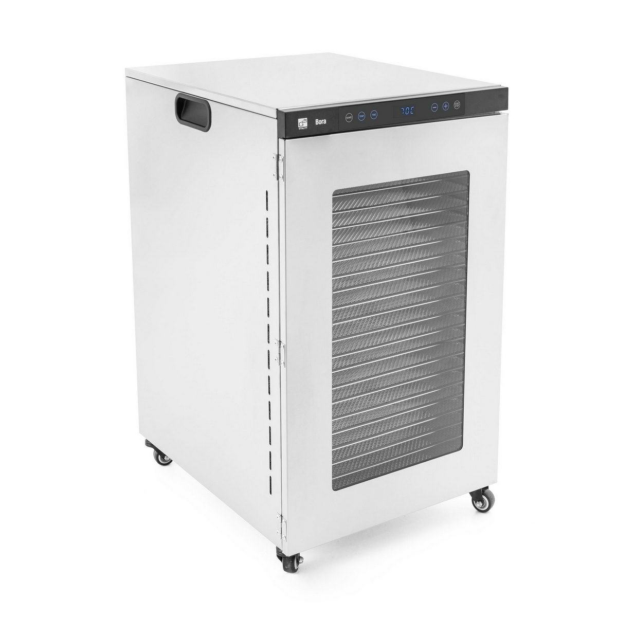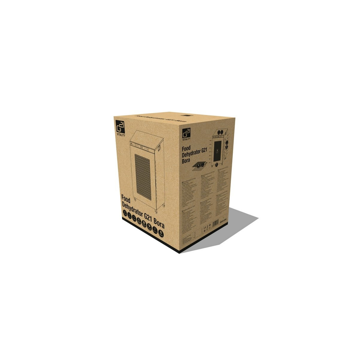 G21 Bora je profesionální horizontální sušička potravin z nerezu, která zvládá sušení ve velkém objemu a s maximální rovnoměrností. Díky 20 nerezovým platům, dvojitému horizontálnímu větrání a inovativní funkci Rotate usuší ovoce, zeleninu, houby, maso i bylinky rychle, efektivně a bez nutnosti přeskládávání. Matný nerez v kombinaci se skleněným okénkem působí elegantně a zároveň velmi odolně, takže je sušička vhodná do domácností i profesionálních provozů.Výkonný systém pracuje s příkonem 1 730 W a vzduch rovnoměrně rozvádějí dva horizontální ventilátory. Teplota je elektronicky řízená v rozsahu 35–75 °C a díky časovači až 48 hodin máte proces plně pod kontrolou. Velkou výhodou je i automatické vypnutí po dokončení programu. Funkce Rotate pomalu otáčí horní konstrukci, což je ideální pro zavěšené suroviny, které se díky tomu suší ze všech stran rovnoměrně.Robustní konstrukce je doplněná praktickými kolečky, takže sušičku snadno přemístíte podle potřeby. Nerezová plata i jemné vložky se snadno udržují a díky velkorysému vnitřnímu prostoru můžete využít všech 20 pater najednou. Součástí balení je kompletní výbava včetně 20 vložek s jemným síťováním a 10 nerezových háčků, které umožňují profesionální sušení i drobných nebo zavěšených surovin.Specifikace počet plat: 20 + 20 jemných vložek plocha pro sušení: 30 020 cm² rozměr plata: 38 × 39,5 cm výška mezery mezi platy: 2,5 cm háčky pro zavěšení: 10 ks nerez materiál: nerezová ocel výkon: 1 730 W ventilátory: 2× horizontální digitální nastavení teploty: 35–75 °C časovač: 30 min až 48 h automatické vypnutí: ano délka přívodního kabelu: 100 cmObsah balení sušička potravin G21 Bora 20 nerezových sušících plat 20 vložek s jemným síťováním 10 nerezových háčků návod k použití