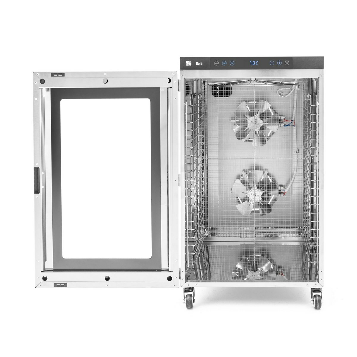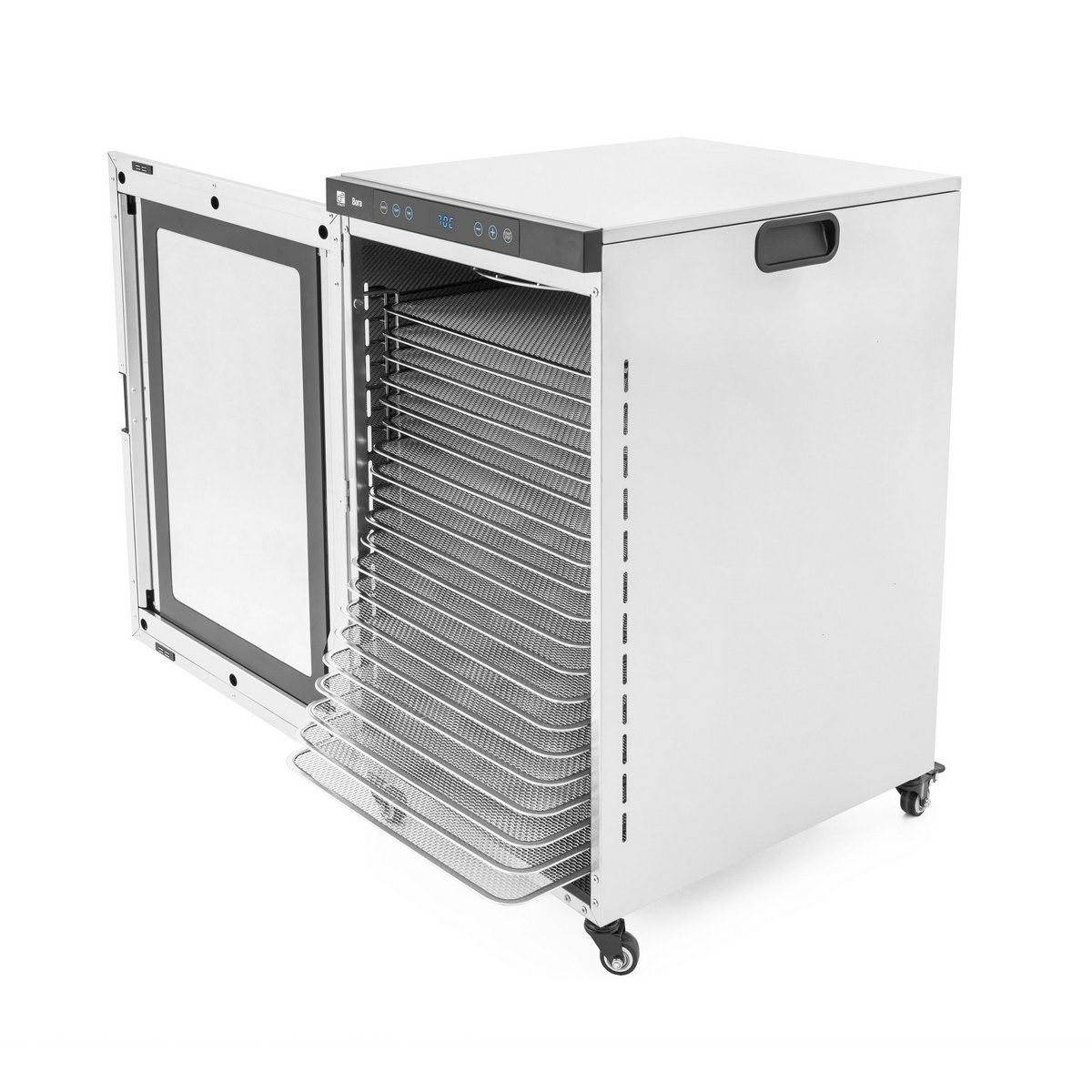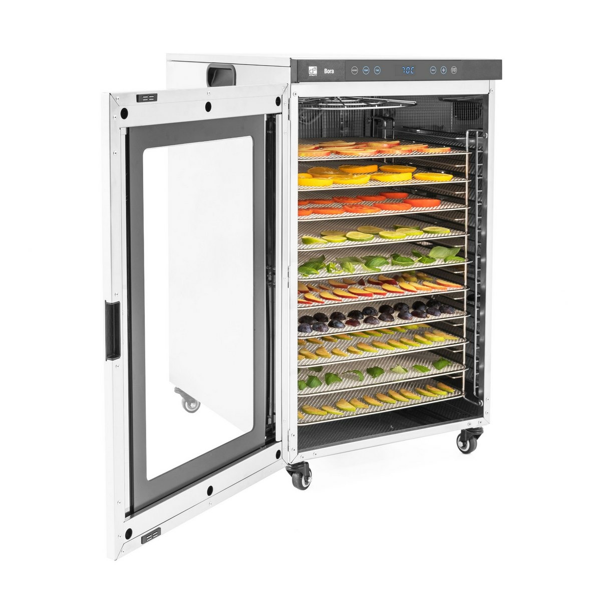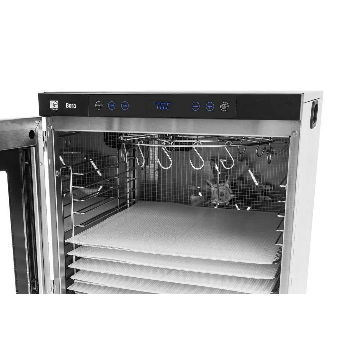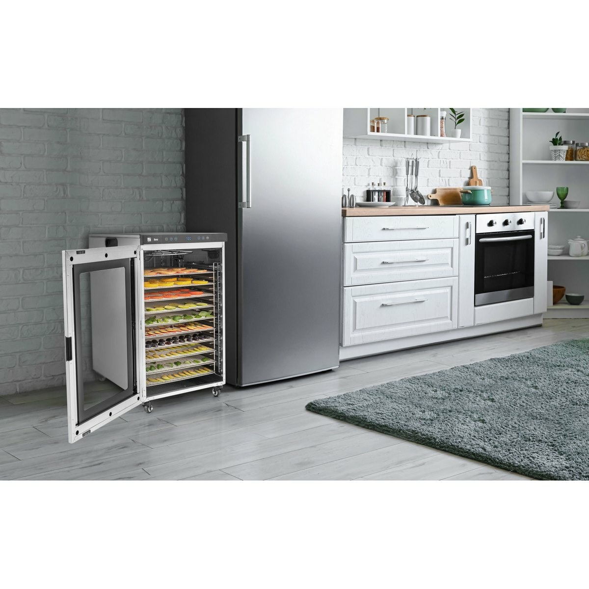 G21 Bora je profesionální horizontální sušička potravin z nerezu, která zvládá sušení ve velkém objemu a s maximální rovnoměrností. Díky 20 nerezovým platům, dvojitému horizontálnímu větrání a inovativní funkci Rotate usuší ovoce, zeleninu, houby, maso i bylinky rychle, efektivně a bez nutnosti přeskládávání. Matný nerez v kombinaci se skleněným okénkem působí elegantně a zároveň velmi odolně, takže je sušička vhodná do domácností i profesionálních provozů.Výkonný systém pracuje s příkonem 1 730 W a vzduch rovnoměrně rozvádějí dva horizontální ventilátory. Teplota je elektronicky řízená v rozsahu 35–75 °C a díky časovači až 48 hodin máte proces plně pod kontrolou. Velkou výhodou je i automatické vypnutí po dokončení programu. Funkce Rotate pomalu otáčí horní konstrukci, což je ideální pro zavěšené suroviny, které se díky tomu suší ze všech stran rovnoměrně.Robustní konstrukce je doplněná praktickými kolečky, takže sušičku snadno přemístíte podle potřeby. Nerezová plata i jemné vložky se snadno udržují a díky velkorysému vnitřnímu prostoru můžete využít všech 20 pater najednou. Součástí balení je kompletní výbava včetně 20 vložek s jemným síťováním a 10 nerezových háčků, které umožňují profesionální sušení i drobných nebo zavěšených surovin.Specifikace počet plat: 20 + 20 jemných vložek plocha pro sušení: 30 020 cm² rozměr plata: 38 × 39,5 cm výška mezery mezi platy: 2,5 cm háčky pro zavěšení: 10 ks nerez materiál: nerezová ocel výkon: 1 730 W ventilátory: 2× horizontální digitální nastavení teploty: 35–75 °C časovač: 30 min až 48 h automatické vypnutí: ano délka přívodního kabelu: 100 cmObsah balení sušička potravin G21 Bora 20 nerezových sušících plat 20 vložek s jemným síťováním 10 nerezových háčků návod k použití