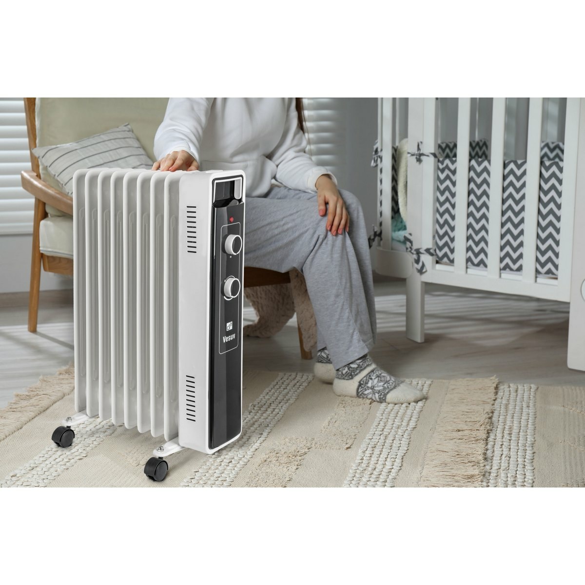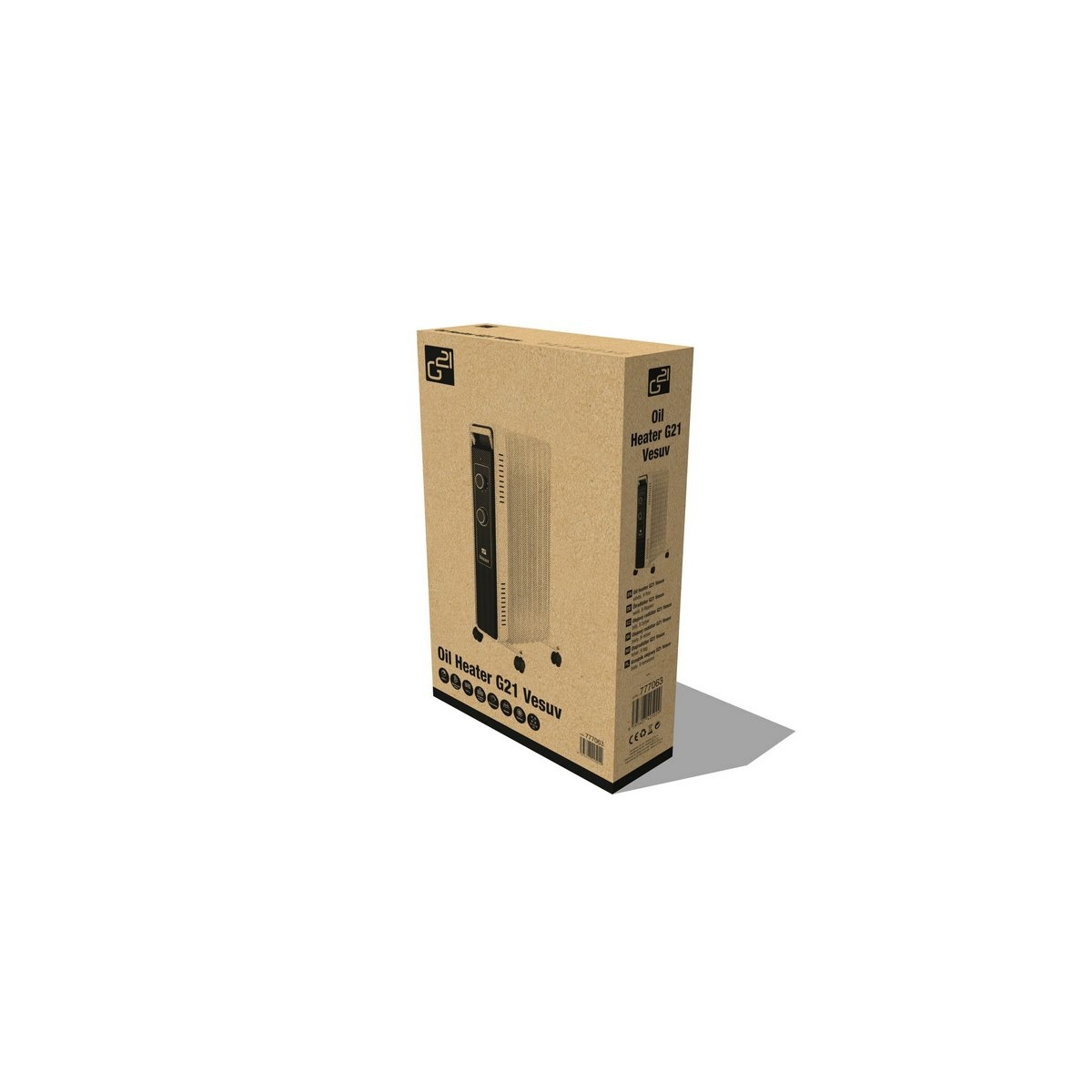 G21 Olejový radiátor Vesuv, 9 žeber, 2000 W, bílá je spolehlivé, výkonné a tiché topidlo určené k vytápění i přitápění místností s nedostatečným nebo chybějícím topením. Devět žeber zajišťuje rychlé nahřátí a dlouhé sálání tepla díky akumulaci v olejové náplni, takže je radiátor ideální do ložnic, obývacích pokojů, pracoven nebo na chatu.Pracuje velmi tiše, což umožňuje jeho používání i během spánku. Termostat hlídá zvolenou teplotu a radiátor se spouští jen tehdy, když je to potřeba. Tím udržuje stabilní klima a zároveň šetří energii.Díky kolečkům a praktickým madlům jej snadno přesunete tam, kde je zrovna potřeba. Samozřejmostí je bezpečnostní pojistka proti převržení, která při pádu okamžitě přístroj vypne. Elegantní bílé provedení se hodí do jakéhokoliv interiéru.Specifikace Počet žeber: 9 Výkon: 800 W / 1200 W / 2000 W Teplotní rozsah: 0–85 °C Barva: bílá Rozměry (s pojezdem): 24 × 62 × 38 cm
