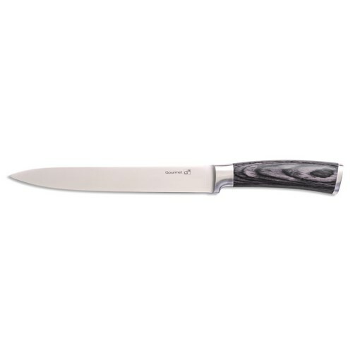 Nůž je jedním z nejpoužívanějších kuchyňských nástrojů. Hledáte ideální sadu kuchyňských nožů? Pořiďte si kvalitní a extra ostré nože G21 Gourmet Rustic. Praktická sada nožů v délkách od 9 cm do 21 cm potěší všechny milovníky kvalitního ostří.Složení sady 5 ostrých nožů G21 Gourmet RusticV sadě nožů G21 Gourmet Rustic najdete nůž šéfkuchaře 21 cm, krájecí nůž 21 cm, nůž na chléb 21 cm, univerzální nůž 13 cm a krájecí nůž 9 cm. Všech 5 nožů je z kvalitní oceli5CR15, která se používá i pro výrobu loveckých nožů.Jak pečovat o nože? Ukládejte je do stojanuSprávná péče o kuchyňské nože prodlouží jejich životnost a ostrost čepelí. Základem správné péče o nože je jejich vhodné ukládání – ideálně do stojanu na nože. Proto k sadě nožů G21 Gourmet Rustic dostanete i originální blok na nože z vysoce odolného bambusového dřeva s elegantní černou kovovou lištou na čelní straně stojanu na nože.Díky použitému materiálu je čepel ostrá, odolná, pevná a bude vám sloužit dlouhé roky. Rukojeti jsou vyrobeny z extra pevného, odolného materiálu nazývaného Pakka wood, při jehož výrobě je dýha z tvrdého dřeva napuštěna teplem tvrzenou pryskyřicí. Výsledkem jsou pevné rukojeti, které nepodléhají zkáze času. Hladké, rovné, čisté linie těchto nožů se stanou ozdobou každé kuchyně.Parametry a specifikace počet nožů v sadě: 5 ks materiál: ocel 5CR15 materiál rukojetí: Pakka wood v černé barvě materiál stojánku: bambus ýška stojanu s noži: 22 cm šířka stojanu: 15 cm loubka stojanu: 9 cm hmotnost: 3 kgObsah balení nůž šéfkuchaře 21 cm krájecí nůž 21 cm nůž na chléb 21 cm univerzální nůž 13 cm krájecí nůž 9 cm stojan certifikace: LFGB