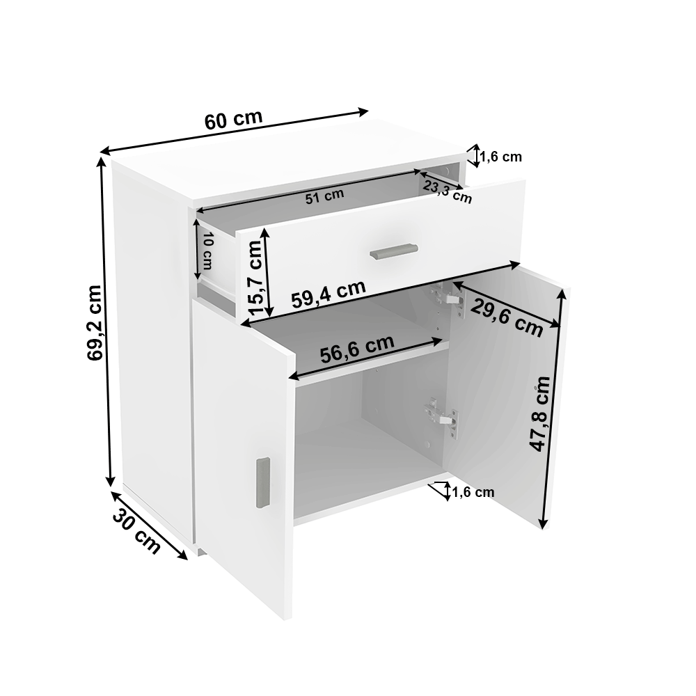 Komoda ADELI je ideálním řešením pro všechny, kdo hledají kompaktní a zároveň stylový úložný prostor. Díky svému jednoduchému a čistému designu v bílé barvě snadno zapadne do moderních i tradičních interiérů. Její univerzální vzhled z ní činí praktický doplněk do ložnice, předsíně, obývacího pokoje nebo dětského pokoje. Přestože má menší rozměry, nabídne dostatek místa pro uložení věcí každodenní potřeby.Komoda je vybavena dvěma dvířky a jednou zásuvkou, které se pohodlně otevírají pomocí stříbrných úchytů. Za dvířky se nachází praktická police, vhodná například pro oblečení, knihy nebo jiné drobnosti. Horní plocha komody poskytuje ideální prostor pro dekorace, květiny nebo rámečky s fotografiemi. Celá konstrukce je vyrobena z odolné laminované dřevotřísky, která se snadno udržuje a je odolná vůči každodennímu opotřebení.Kromě příjemného vzhledu oceníte i kvalitní zpracování slovenské výroby. Komoda ADELI je dodávána v demontovaném stavu s přehledným návodem pro jednoduchou montáž. Díky svým kompaktním rozměrům se hodí i do menších prostor a nabízí praktické řešení pro přehledné uspořádání věcí.Parametry a specifikace: Materiál: DTD laminovaná Barva: bílá Rozměry (ŠxHxV): 60 x 30 x 69,2 cm Rozměry dvířek (ŠxV): 29,6 x 47,8 cm Vnější rozměry šuplíku (ŠxHxV): 59,4 x 25 x 15,7 cm Vnitřní rozměry zásuvky (ŠxHxV): 51 x 23,3 x 10 cm Tloušťka materiálu: 1,6 cm Šířka police: 56,6 cm Nosnost police: 5 kg Výška nožiček: 1,6 cm Dodáváno v demontu