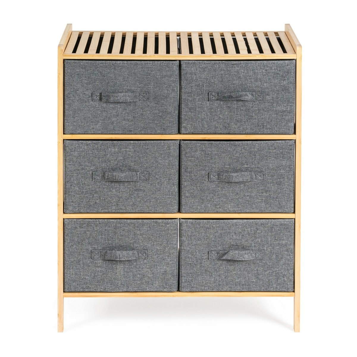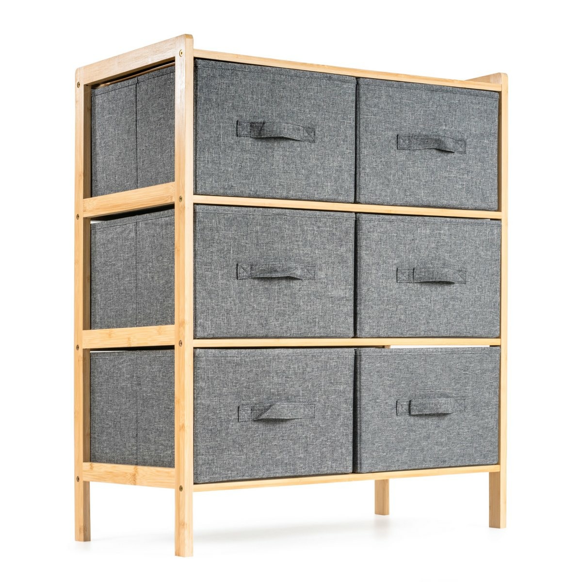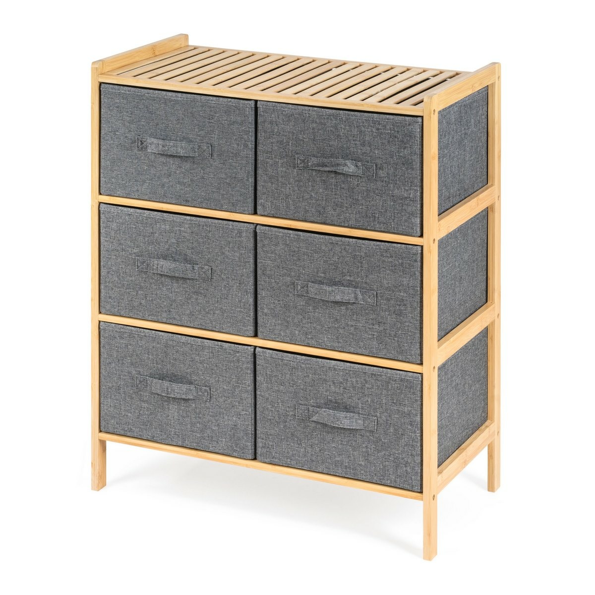 G21 Bambusový regál s košíky, 3 police, šedá je praktické a elegantní řešení pro uložení hraček, oblečení, kosmetiky či dalších drobností, které chcete mít po ruce, ale zároveň schované. Nabízí 6 výsuvných skládacích košíků o objemu 20 l, které jsou lehké, pevné a snadno udržovatelné – stačí je otřít. Konstrukce z přírodního bambusu působí moderně, přirozeně a krásně doplní dětský pokoj, ložnici i koupelnu. Díky nízké výšce regálu je manipulace snadná a jeho odolnost vůči vlhkosti umožňuje použití i v prádelně či koupelně.Parametry produktu materiál regálu: bambus materiál košíků: polyester počet košíků: 6 objem jednoho košíku: 20 l nosnost jedné police: 5 kg rozměry regálu: 66 × 78 × 35 cm rozměry košíku: 31 × 35 × 19 cm