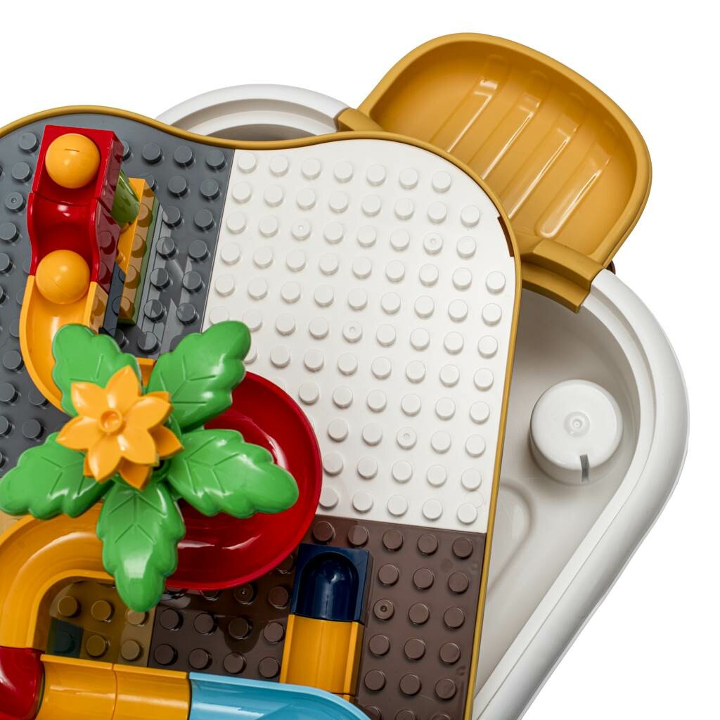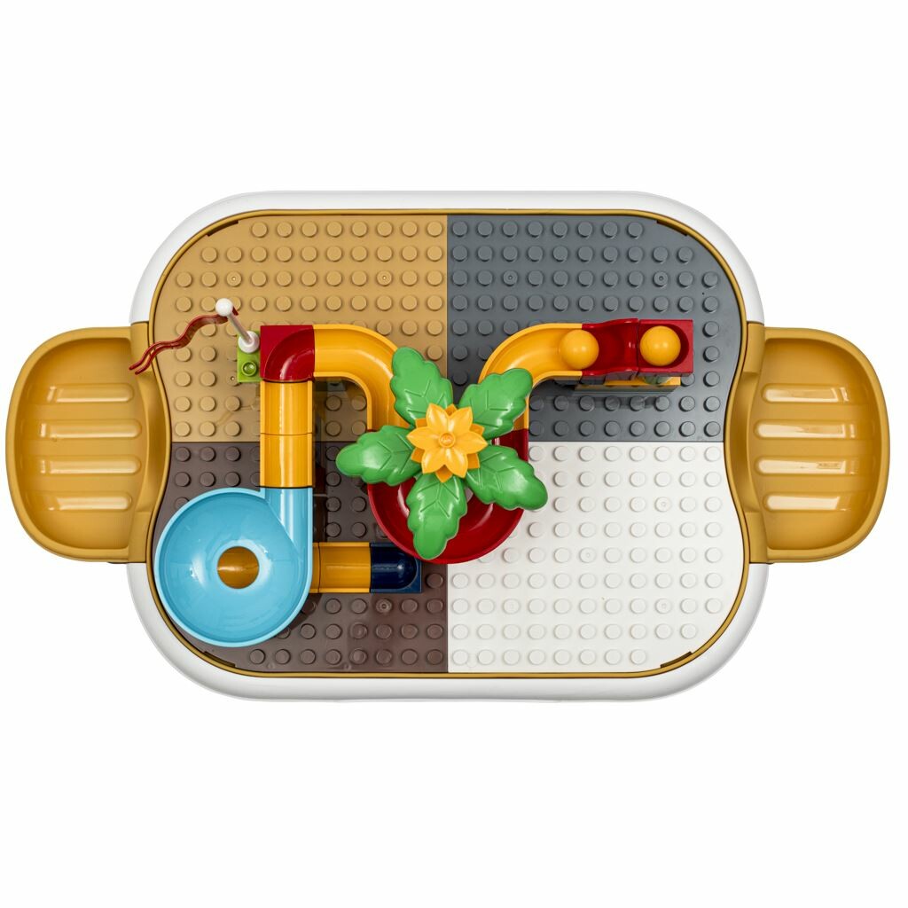 Hrací stolek se stavebnicí jistě uchvátí všechny malé konstruktéry. Z kostiček v sadě můžete postavit kuličkovou dráhu. Po stranách jsou malé odkládací poličky. Po skončení hraní stůl složíte do kufříku a díky kompaktním rozměrům si vaše dítě může hračku vzít s sebou třeba na prázdniny k babičce. Kostky jsou kompatibilní s Legem.Rozměry balení: 42 x 10,5 x 33,5 cm