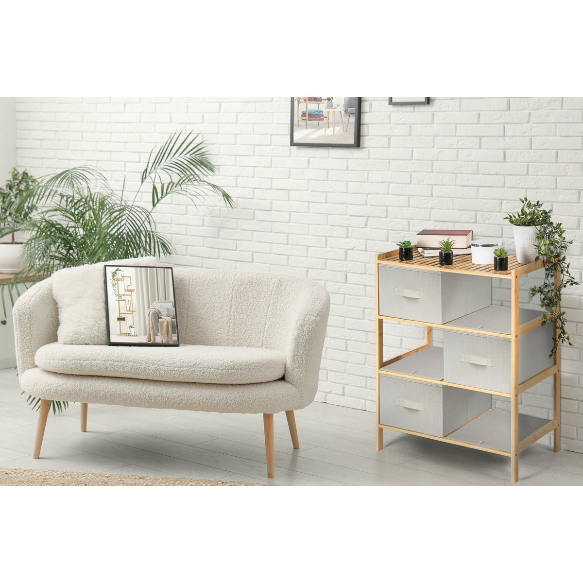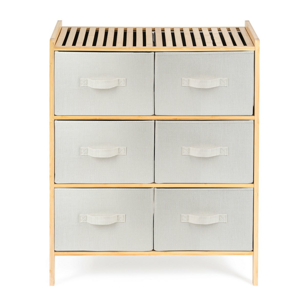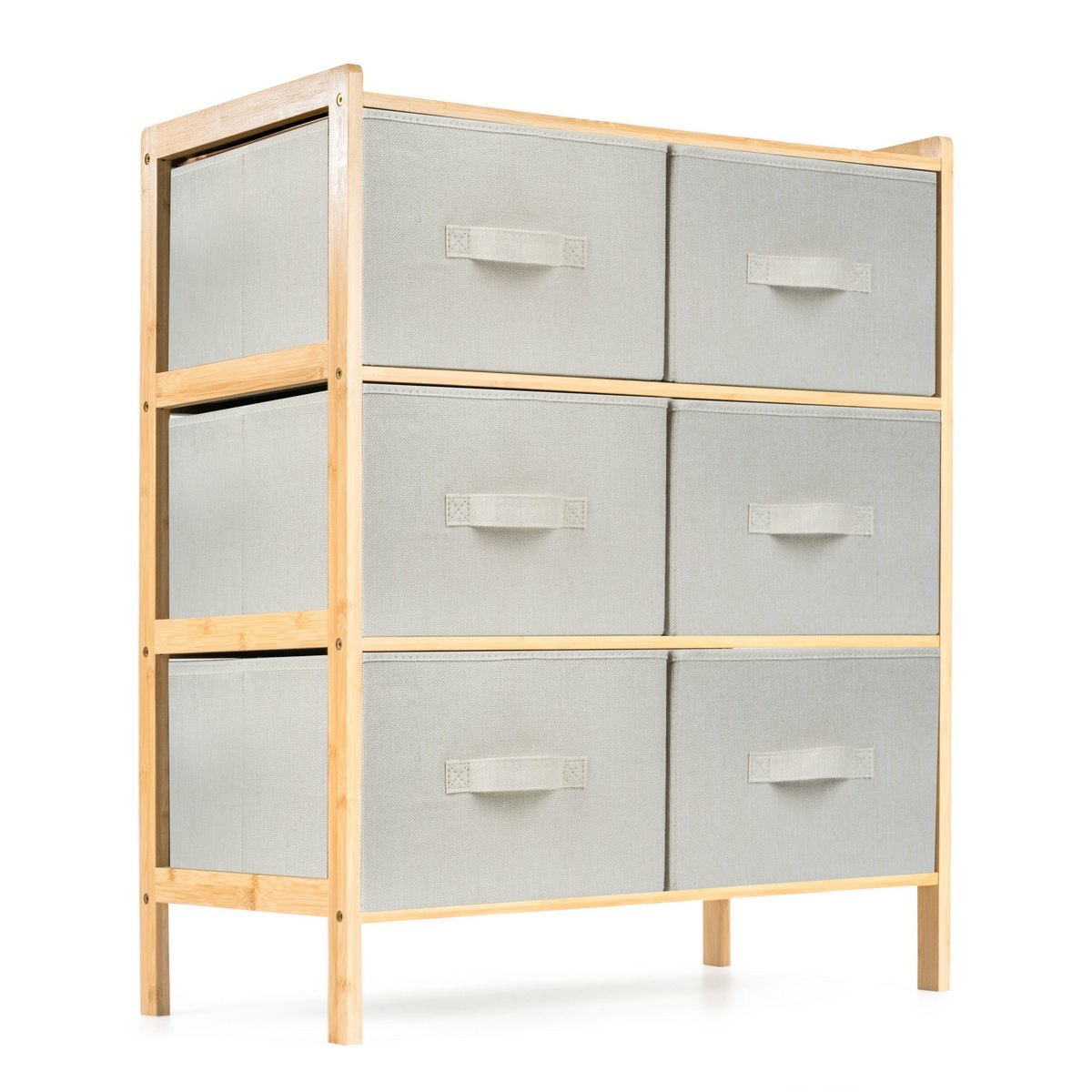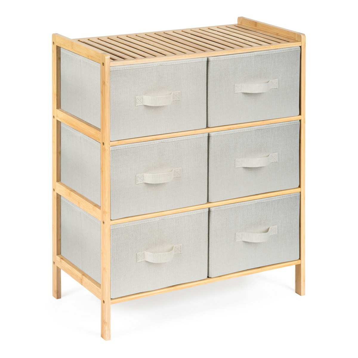 G21 Bambusový regál s košíky, 3 police, béžová je praktické a elegantní řešení pro uložení hraček, oblečení, kosmetiky nebo dalších drobností, které chcete mít uspořádané, ale zároveň schované. Nabízí 6 výsuvných skládacích košíků o objemu 20 l, které jsou lehké, pevné a snadno udržovatelné – stačí je otřít. Konstrukce z přírodního bambusu působí moderně, vzdušně a dobře ladí s ložnicí, dětským pokojem i koupelnou. Díky nízké výšce regálu se s ním snadno manipuluje a jeho přirozená odolnost vůči vlhkosti zaručuje dlouhou životnost.Parametry produktu materiál regálu: bambus materiál košíků: polyester počet košíků: 6 objem jednoho košíku: 20 l nosnost jedné police: 5 kg rozměry regálu: 66 × 78 × 35 cm rozměry košíku: 31 × 35 × 19 cm