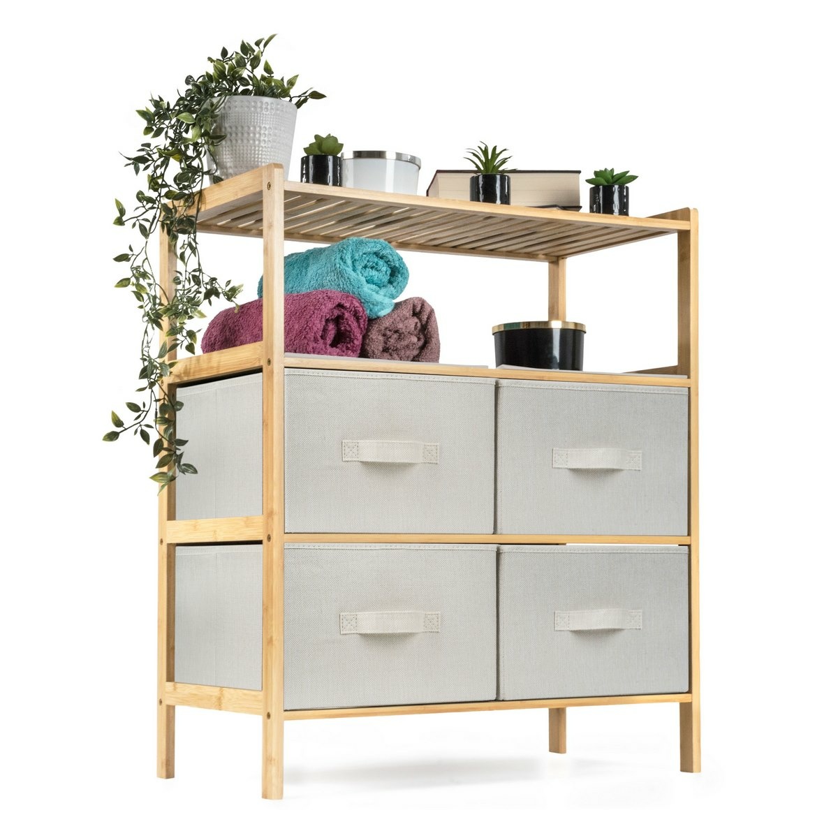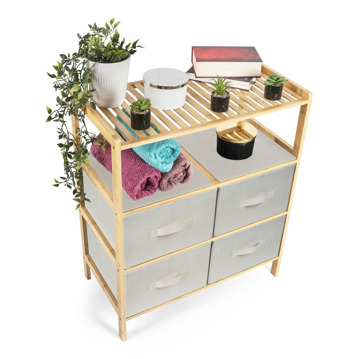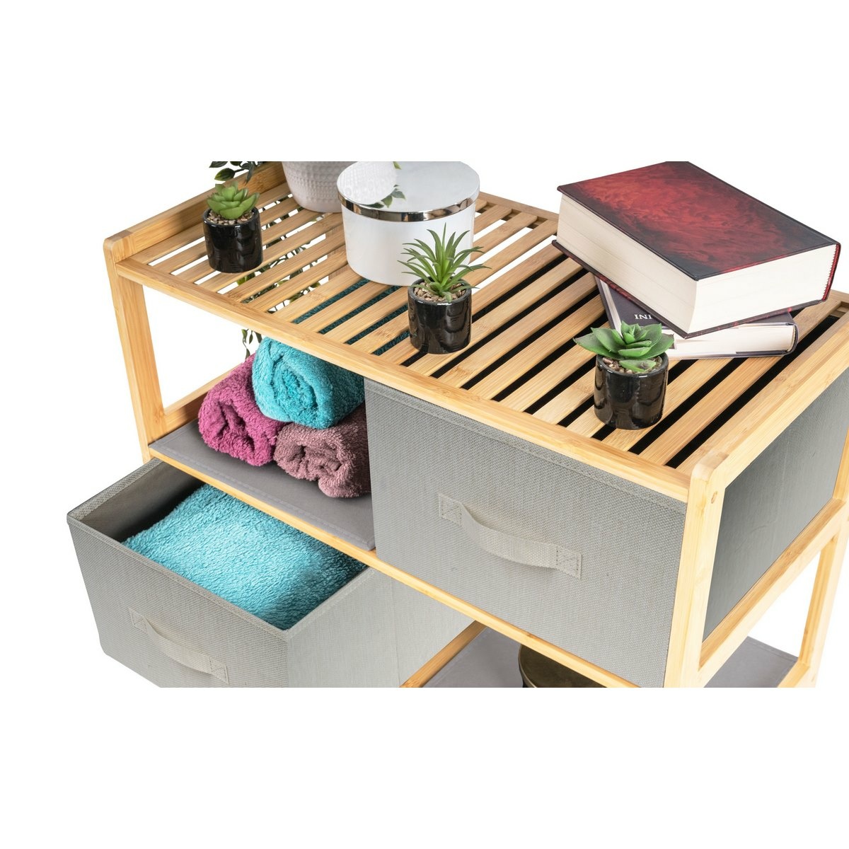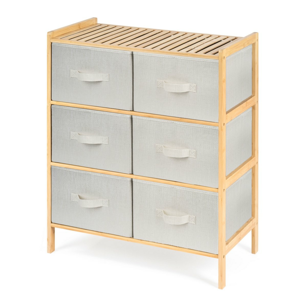 G21 Bambusový regál s košíky, 3 police, béžová je praktické a elegantní řešení pro uložení hraček, oblečení, kosmetiky nebo dalších drobností, které chcete mít uspořádané, ale zároveň schované. Nabízí 6 výsuvných skládacích košíků o objemu 20 l, které jsou lehké, pevné a snadno udržovatelné – stačí je otřít. Konstrukce z přírodního bambusu působí moderně, vzdušně a dobře ladí s ložnicí, dětským pokojem i koupelnou. Díky nízké výšce regálu se s ním snadno manipuluje a jeho přirozená odolnost vůči vlhkosti zaručuje dlouhou životnost.Parametry produktu materiál regálu: bambus materiál košíků: polyester počet košíků: 6 objem jednoho košíku: 20 l nosnost jedné police: 5 kg rozměry regálu: 66 × 78 × 35 cm rozměry košíku: 31 × 35 × 19 cm