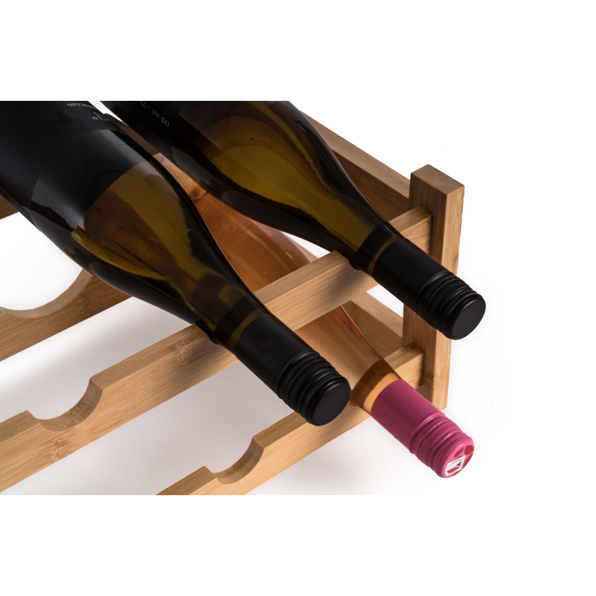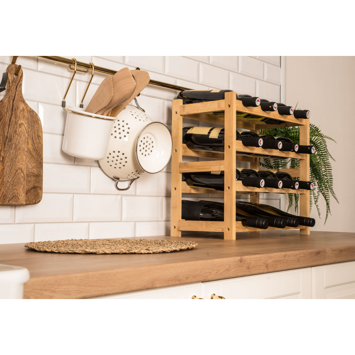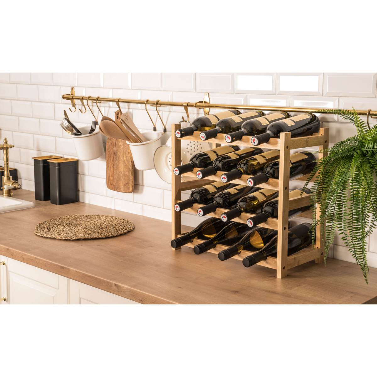 G21 Bambusový regál na víno, 16 lahví je elegantní, kompaktní a mimořádně praktické řešení pro každého milovníka vína, který chce mít svou sbírku uloženou bezpečně, přehledně a zároveň stylově. Precizně opracované bambusové dřevo mu dodává přírodní vzhled a příjemnou atmosféru, díky níž skvěle zapadne do moderních i tradičních interiérů.Stojan pojme až 16 lahví, které jsou uloženy ve správné vodorovné poloze, aby nedocházelo k vysychání korku a víno si uchovalo svou kvalitu. Díky důmyslně vytvořeným výřezům v bočních lištách jsou lahve stabilní a nehrozí jejich převržení. Kompaktní konstrukce šetří místo a umožňuje mít vína přehledně srovnaná a připravená k servírování.Bambus jako materiál nabízí perfektní rovnováhu mezi pevností, nízkou hmotností a odolností vůči okolním vlivům. Regál se snadno přenáší, zůstává stabilní a zároveň je ekologickou volbou s dlouhou životností. Díky své velikosti je ideální do kuchyní, jídelen, obývacích pokojů či domácích vinoték a poslouží také jako skvělý dárek pro milovníky vína.Specifikace Kapacita: 16 lahví Počet polic: 4 Nosnost jedné police: 5 kg Materiál: bambus Rozměry (š × h × v): 45 × 23,5 × 42,4 cm