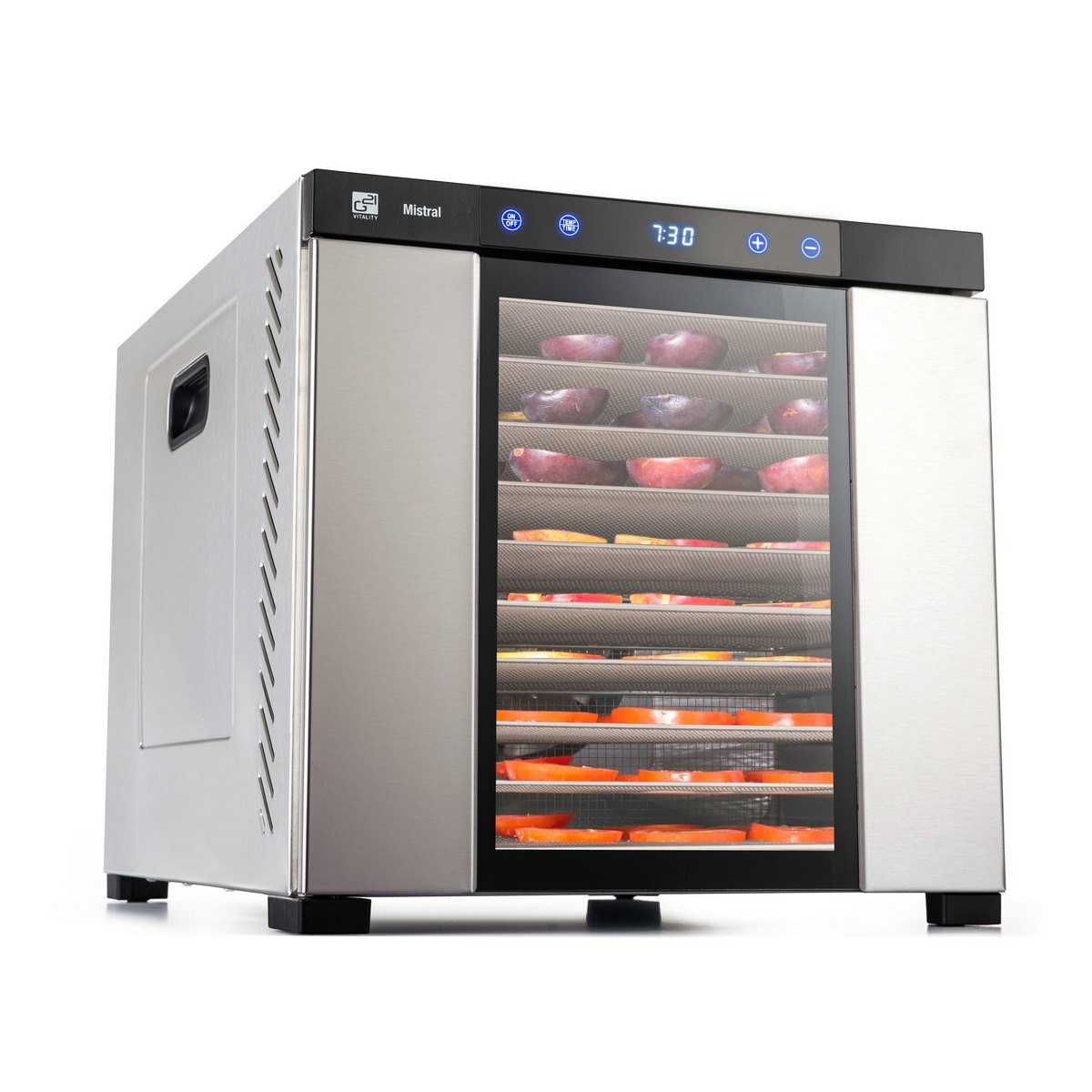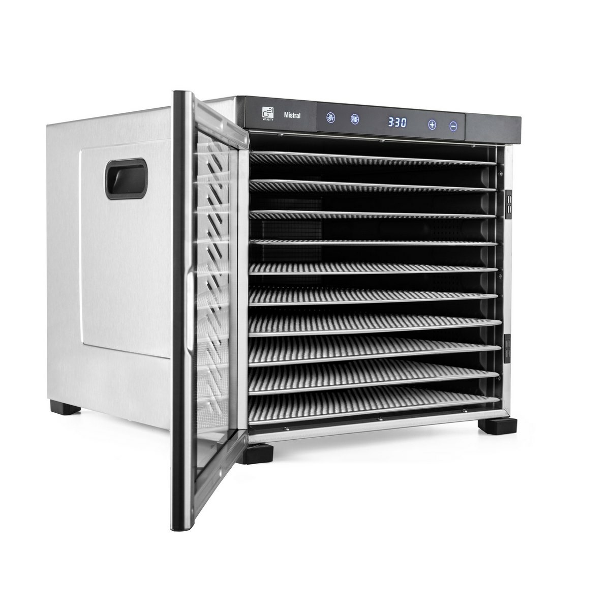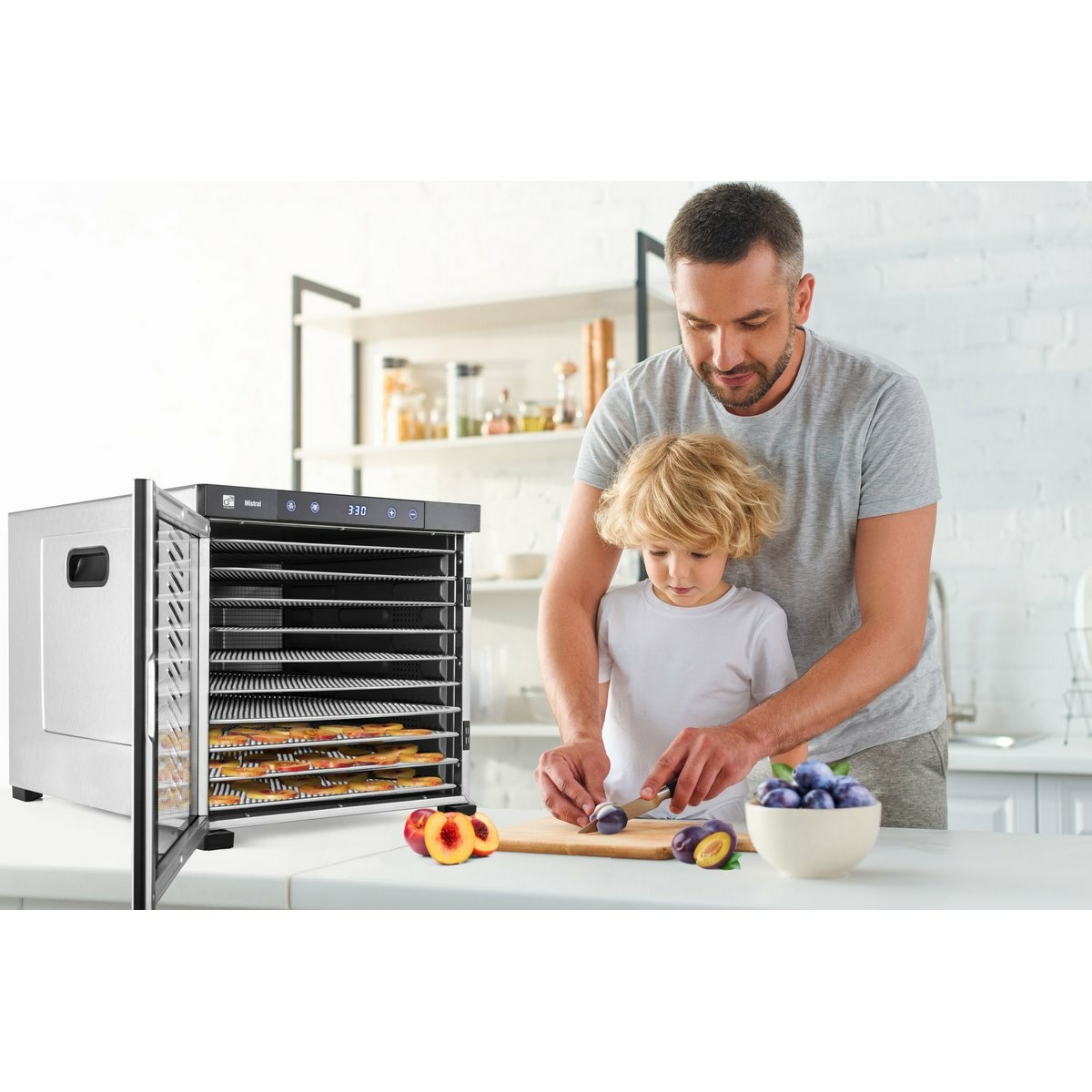 G21 Sušička ovoce Mistral, nerez je profesionálně zpracovaná horizontální sušička potravin, která zaujme vysokým výkonem, precizním zpracováním a maximálním komfortem při používání. Celé tělo i všechna plata jsou vyrobena z odolné nerezové oceli, která nevyžaduje speciální údržbu, je zdravotně nezávadná a výrazně prodlužuje životnost přístroje. Díky horizontálnímu proudění vzduchu suší rovnoměrně po celé ploše, takže nemusíte nic přeskládávat ani otáčet.Nerezová dvířka s praktickým okénkem umožňují kontrolu průběhu sušení bez otevírání, což zabraňuje úniku tepla a šetří energii. Sušička disponuje digitálním časovačem, regulací teploty v rozsahu 35–75 °C a automatickým vypnutím po dokončení programu. Nadstandardní výkon 1 100 W zajistí rychlé a efektivní sušení ovoce, zeleniny, bylinek, hub i masa, takže je vhodná nejen pro domácnosti, ale i do menších provozoven či restaurací.Součástí výbavy je 10 velkých nerezových plat a 10 vložek s jemným síťováním, díky kterým snadno usušíte i drobné suroviny – bylinky, mandle, semínka nebo domácí müsli. Dvojité stěny navíc zlepšují tepelnou izolaci, přičemž celková hlučnost pouhých 52 dB zaručuje komfortní provoz.Parametry produktu počet plat: 10 plocha pro sušení: 15 010 cm² rozměr plata: 38 × 39,5 cm výška mezi platy: 4 cm výkon: 1 100 W teplota: 35–75 °C, digitální nastavení časovač: 30 min – 48 h, automatické vypnutíObsah balení sušička potravin G21 Mistral 10× nerezové sušící plato 10× vložka s jemným síťováním