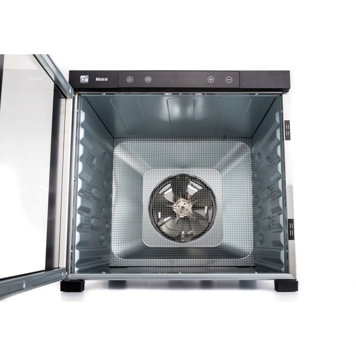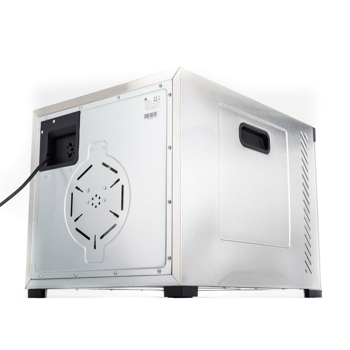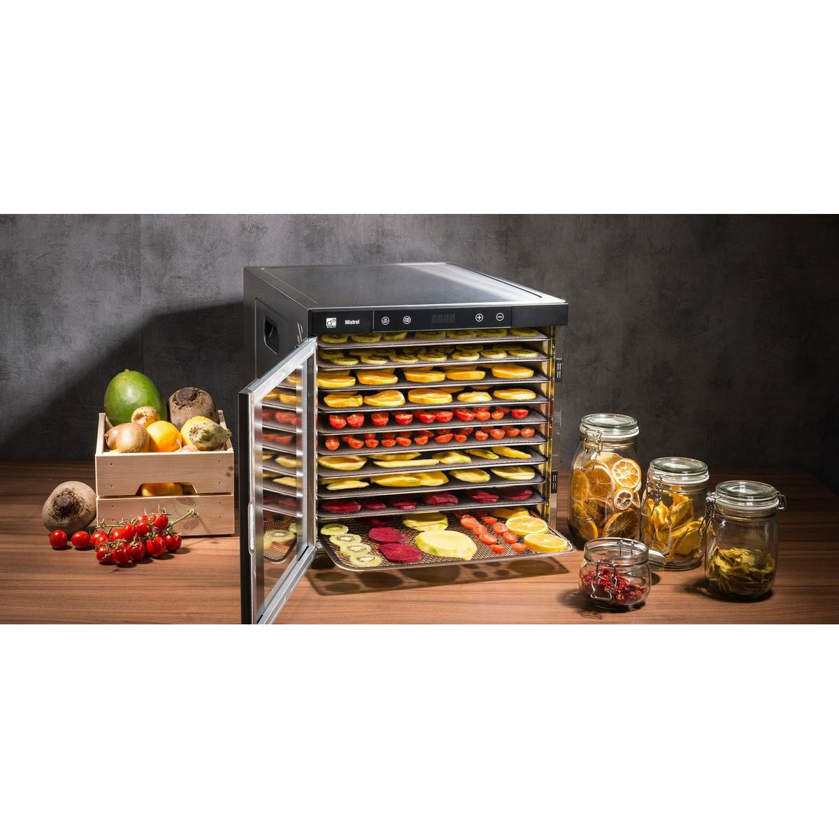G21 Sušička ovoce Mistral, nerez je profesionálně zpracovaná horizontální sušička potravin, která zaujme vysokým výkonem, precizním zpracováním a maximálním komfortem při používání. Celé tělo i všechna plata jsou vyrobena z odolné nerezové oceli, která nevyžaduje speciální údržbu, je zdravotně nezávadná a výrazně prodlužuje životnost přístroje. Díky horizontálnímu proudění vzduchu suší rovnoměrně po celé ploše, takže nemusíte nic přeskládávat ani otáčet.Nerezová dvířka s praktickým okénkem umožňují kontrolu průběhu sušení bez otevírání, což zabraňuje úniku tepla a šetří energii. Sušička disponuje digitálním časovačem, regulací teploty v rozsahu 35–75 °C a automatickým vypnutím po dokončení programu. Nadstandardní výkon 1 100 W zajistí rychlé a efektivní sušení ovoce, zeleniny, bylinek, hub i masa, takže je vhodná nejen pro domácnosti, ale i do menších provozoven či restaurací.Součástí výbavy je 10 velkých nerezových plat a 10 vložek s jemným síťováním, díky kterým snadno usušíte i drobné suroviny – bylinky, mandle, semínka nebo domácí müsli. Dvojité stěny navíc zlepšují tepelnou izolaci, přičemž celková hlučnost pouhých 52 dB zaručuje komfortní provoz.Parametry produktu počet plat: 10 plocha pro sušení: 15 010 cm² rozměr plata: 38 × 39,5 cm výška mezi platy: 4 cm výkon: 1 100 W teplota: 35–75 °C, digitální nastavení časovač: 30 min – 48 h, automatické vypnutíObsah balení sušička potravin G21 Mistral 10× nerezové sušící plato 10× vložka s jemným síťováním