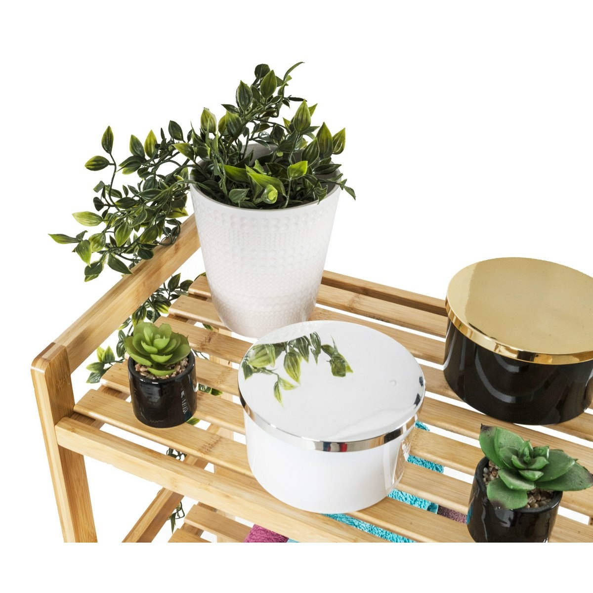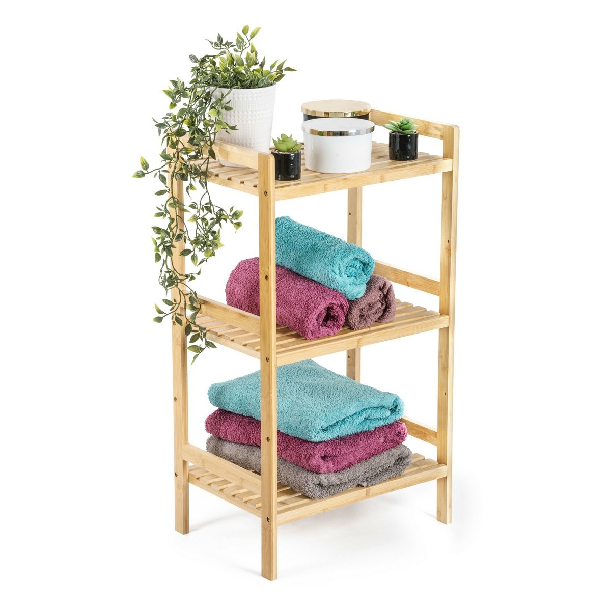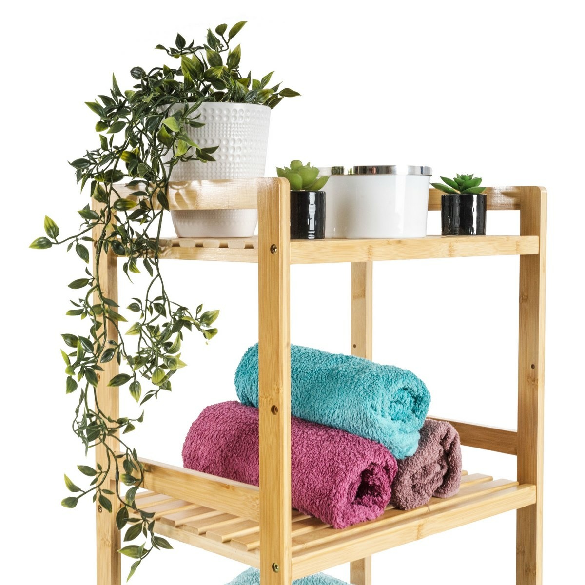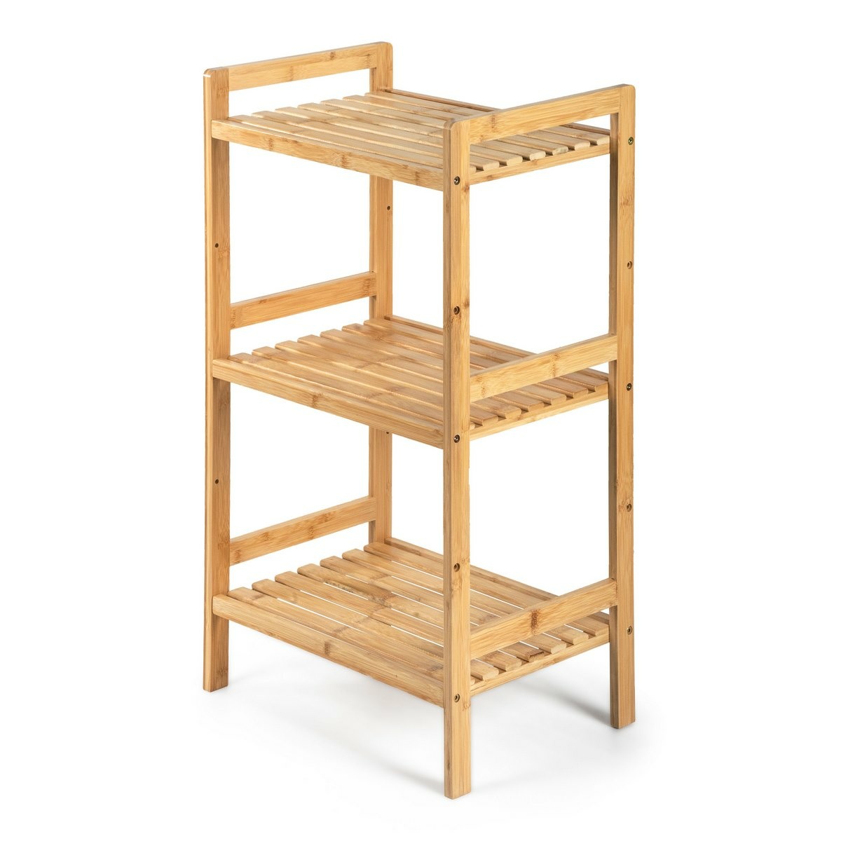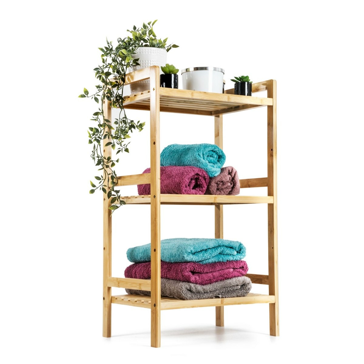 G21 Bambusový regál, 3 police je praktické a stylové řešení pro každou domácnost. Kombinuje přírodní bambusové dřevo, moderní vzhled a nosnost 15 kg na každou polici, takže se hodí do koupelny, ložnice, obýváku i kanceláře. Lehká, ale pevná konstrukce usnadňuje manipulaci, zatímco odolnost vůči vlhkosti umožňuje bezproblémové umístění i v koupelně. Regál působí vzdušně, přináší do interiéru příjemnou přírodní atmosféru a poskytuje dostatek prostoru pro kosmetiku, textil, knihy či drobné vybavení domácnosti.Parametry produktu materiál: bambusové dřevo počet polic: 3 nosnost jedné police: 15 kg rozměry: 45 × 80 × 31,5 cm hloubka police: 31 cm výška mezi policemi: 28,5 cm