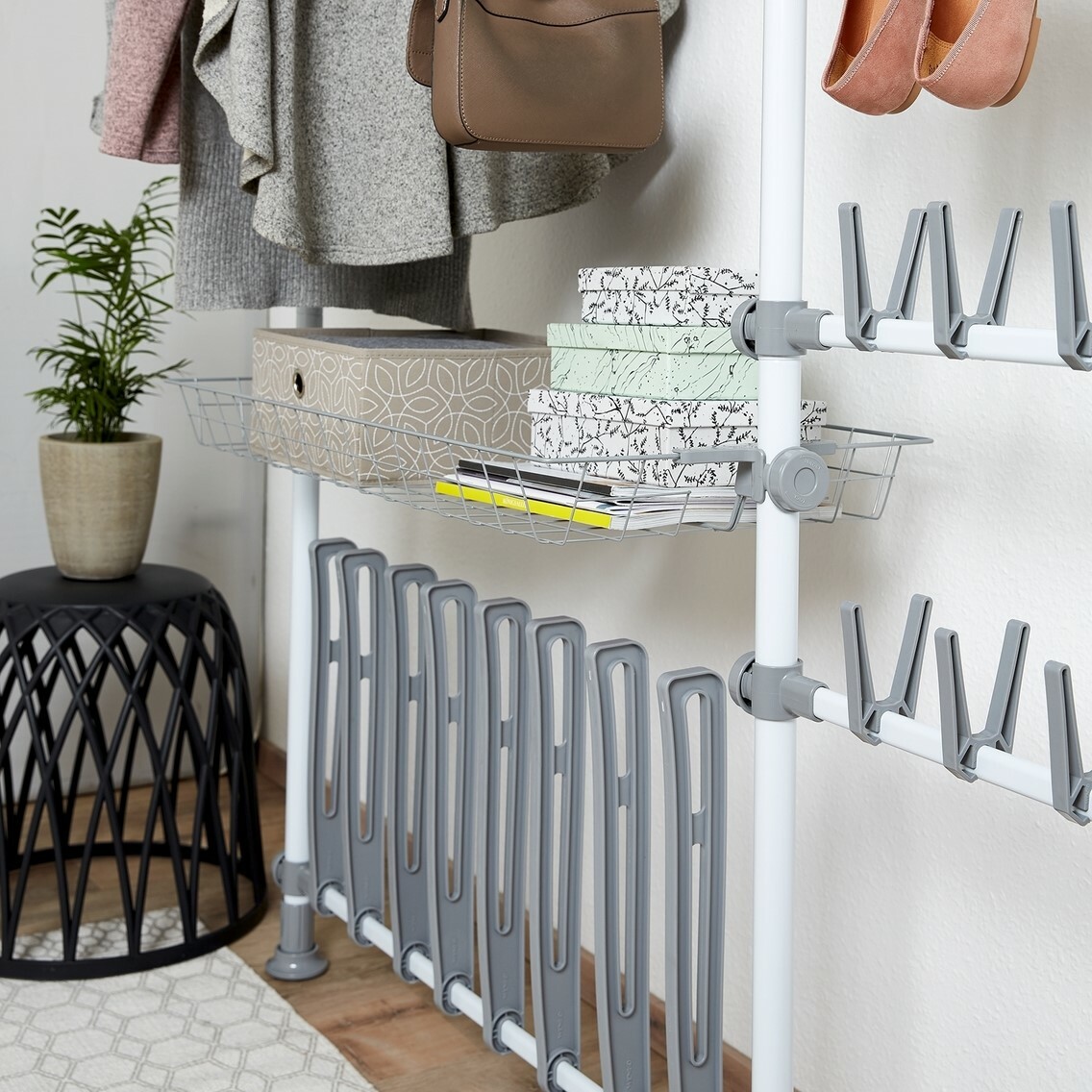 Teleskopická vertikální tyč Herkules od německé značky Wenko je základním prvkem modulárního úložného systémuHerkules, díky kterému si můžete vytvořit šatní sestavu přesně na míru. Tyč slouží jako nosný prvek, mezi který lze snadno upevnit horizontální tyče, police, koše nebo háčky,a postupně tak rozšířit úložný prostor podle vlastních potřeb.Vertikální tyč je výškově nastavitelná od 165 do 300 cm, což umožňuje její použití v různých typech místností. Je vybavena protiskluzovými koncovkami pro bezpečné a stabilní upevnění mezi podlahu a strop, a to bez nutnosti vrtání. Konstrukce z kovu s bílým práškovým nástřikem v kombinaci s kvalitními plastovými prvky zaručuje odolnost, stabilitu a dlouhou životnost.Systém Herkules je variabilní teleskopický úložný systém, který umožňuje vytvořit si osobní šatnu na míru téměř v každém interiéru. Základní verze nabízí šatní tyče pro přehledné uspořádání oblečení, rozšířené varianty přidávají drátěné koše, police či háčky, díky nimž lze pohodlně uložit i obuv, tašky, šátky nebo prádlo. Všechny prvky jsou výškově a šířkově nastavitelné a jejich kombinací si lze sestavit šatní systém přesně podle potřeby – ať už jde o otevřený šatník v ložnici, věšák v předsíni nebo úložný prostor v koupelně. Konstrukce je dostupná v bílé i černé barvě s industriálním nádechem a vyznačuje se vysokou nosností a stabilitou. Montáž vždy probíhá jednoduchým upnutím mezi podlahu a strop, bez vrtání a náročných zásahů do interiéru. Hlavní výhody produktu základní prvek systému Herkules nastavitelná výška od 165 do 300 cm protiskluzové koncovky pro stabilní upevnění pevná a odolná konstrukce z kovu s práškovým nástřikem snadná montáž bez vrtáníObsah balení 1× teleskopická vertikální tyč koncovky pro uchycení mezi podlahu a stropParametry a specifikace materiál: kov s práškovým nástřikem, plastové prvky barva: bílá / šedé koncovky výška 165–300 cm hmotnost: 1,4 kg montáž: bez vrtání, upnutí mezi podlahu a strop