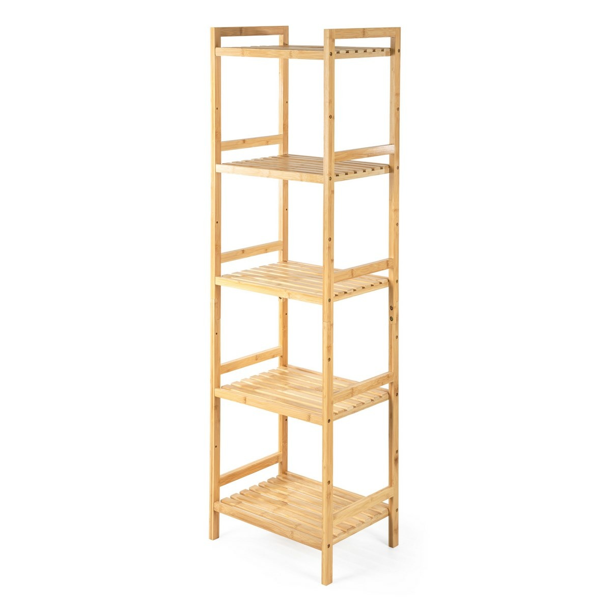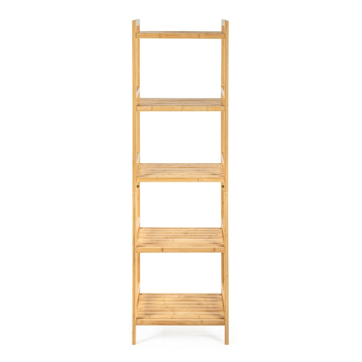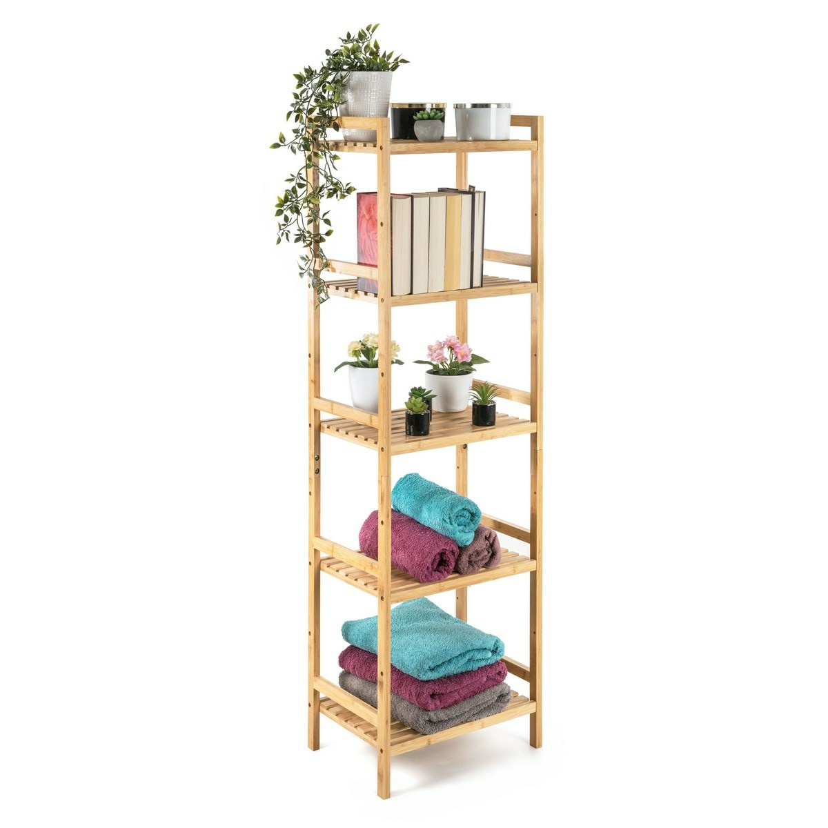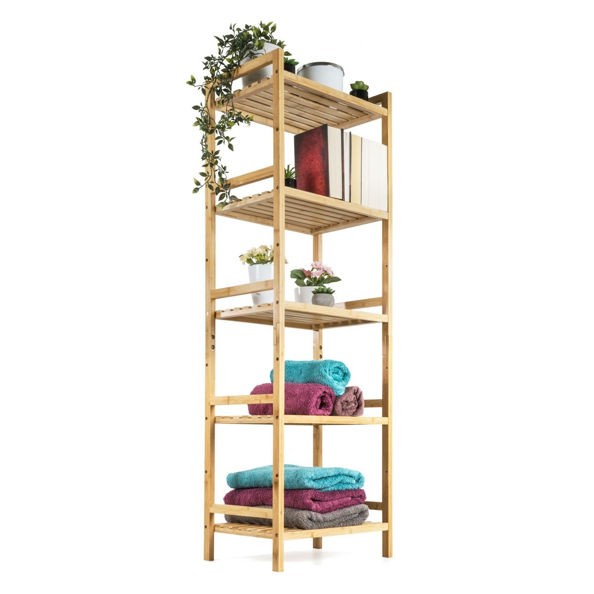 G21 Bambusový regál, 5 polic je elegantní a praktické úložné řešení z přírodního bambusu, které skvěle doplní koupelnu, ložnici, kancelář i obývací pokoj. Nabízí pět prostorných polic s nosností 15 kg na každou, takže poskytuje dostatek místa pro kosmetiku, textil, knihy, dekorace i drobné vybavení domácnosti. Díky lehké, ale pevné konstrukci se s ním snadno manipuluje a jeho odolnost vůči vlhkosti umožňuje použití i v koupelně. Teplý odstín bambusu navodí v interiéru pocit přirozenosti a příjemné atmosféry.Parametry produktu materiál: bambusové dřevo počet polic: 5 nosnost jedné police: 15 kg rozměry: 44 × 142 × 31,5 cm hloubka police: 31 cm výška mezi policemi: 29 cm