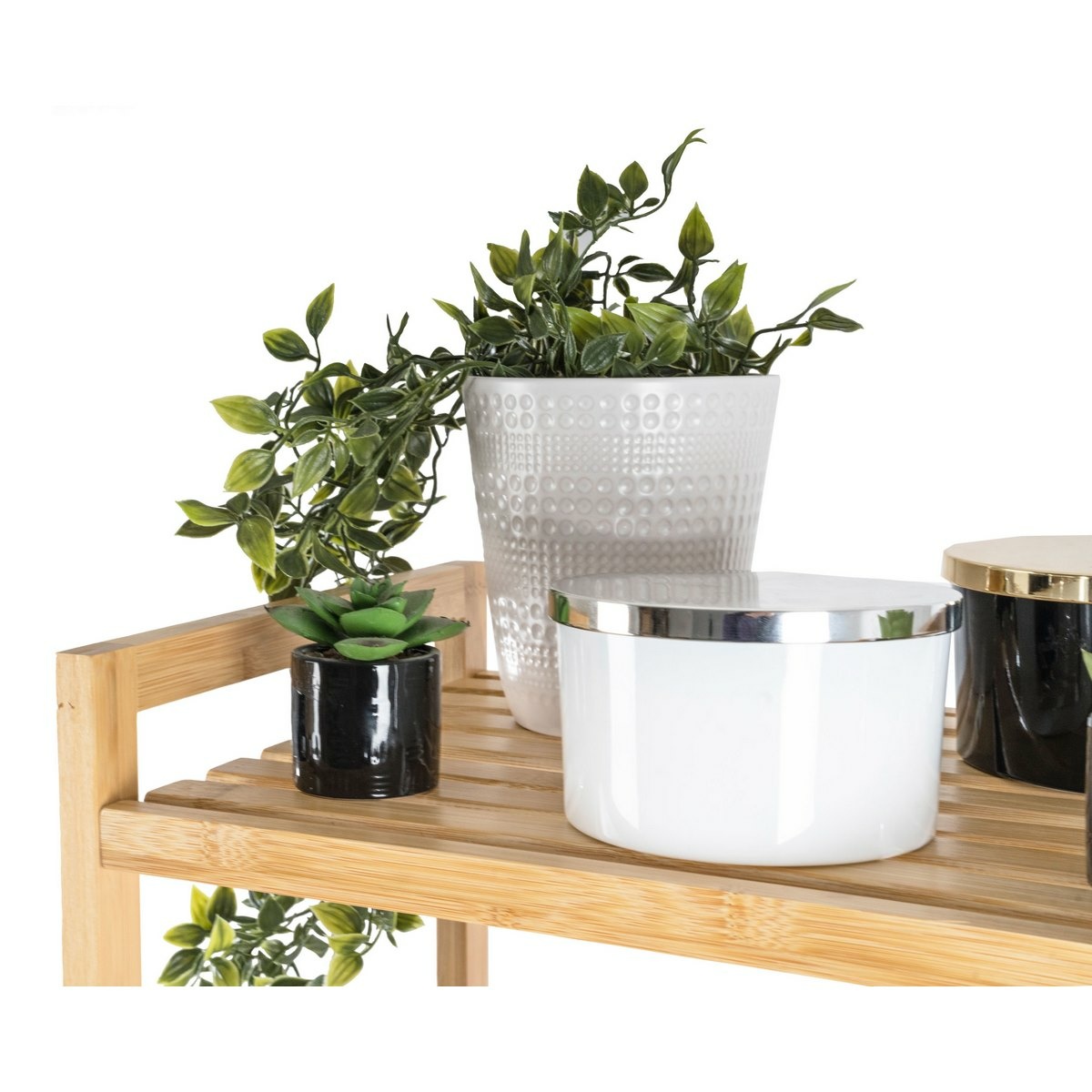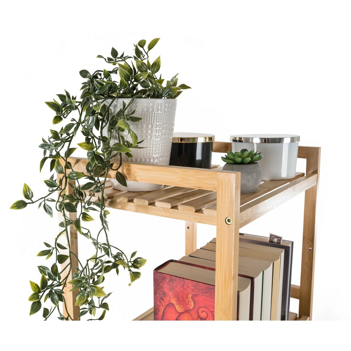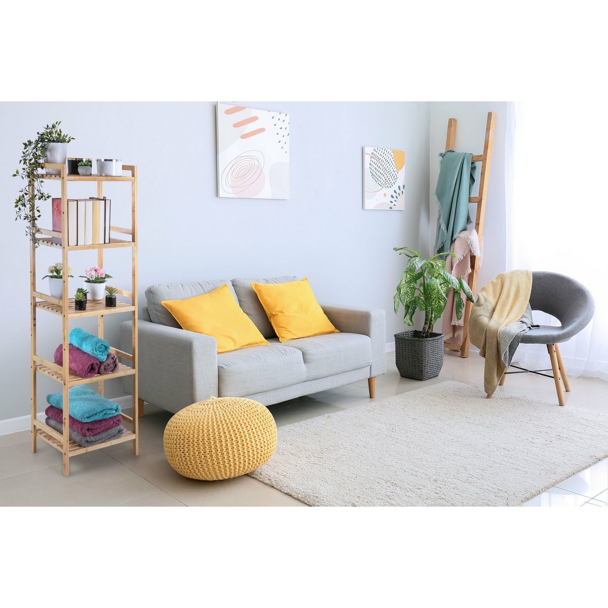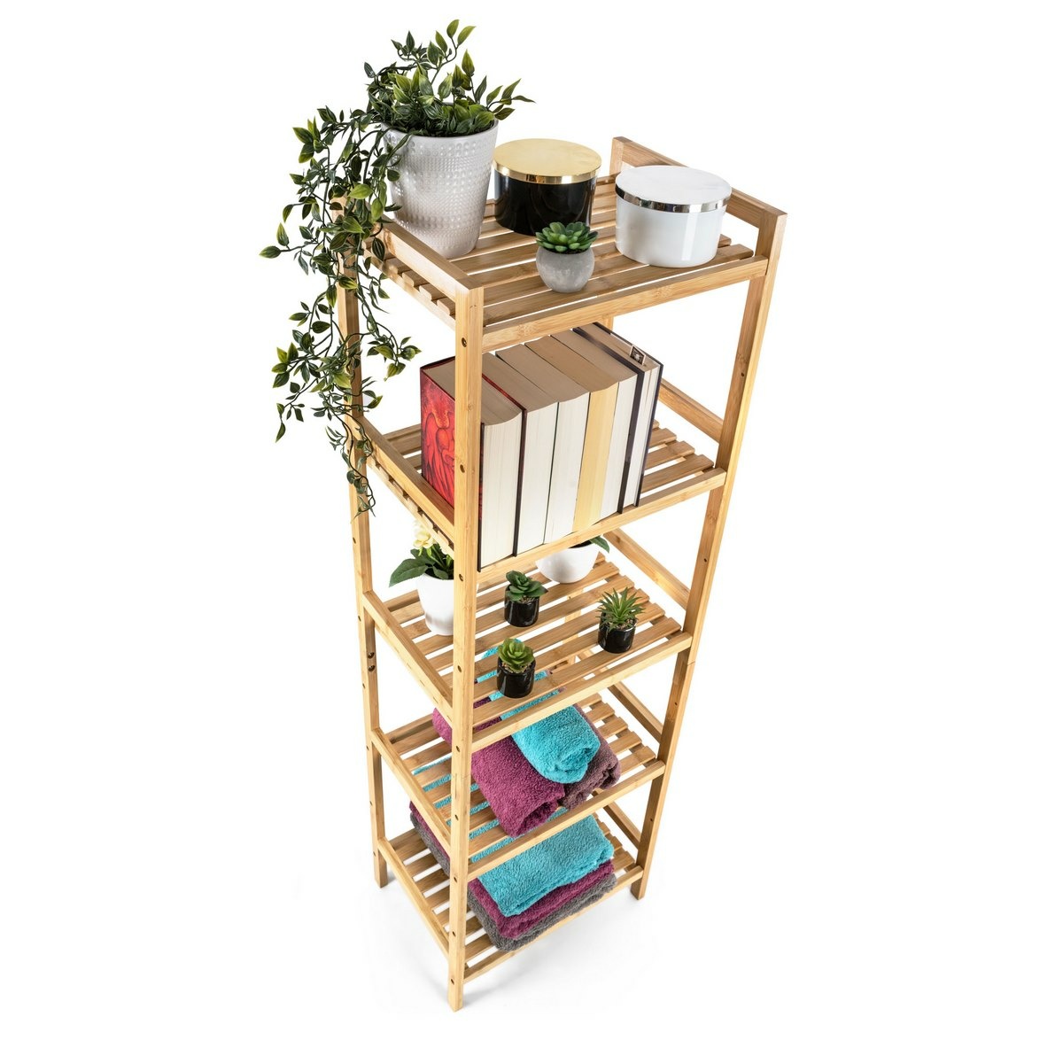 G21 Bambusový regál, 5 polic je elegantní a praktické úložné řešení z přírodního bambusu, které skvěle doplní koupelnu, ložnici, kancelář i obývací pokoj. Nabízí pět prostorných polic s nosností 15 kg na každou, takže poskytuje dostatek místa pro kosmetiku, textil, knihy, dekorace i drobné vybavení domácnosti. Díky lehké, ale pevné konstrukci se s ním snadno manipuluje a jeho odolnost vůči vlhkosti umožňuje použití i v koupelně. Teplý odstín bambusu navodí v interiéru pocit přirozenosti a příjemné atmosféry.Parametry produktu materiál: bambusové dřevo počet polic: 5 nosnost jedné police: 15 kg rozměry: 44 × 142 × 31,5 cm hloubka police: 31 cm výška mezi policemi: 29 cm