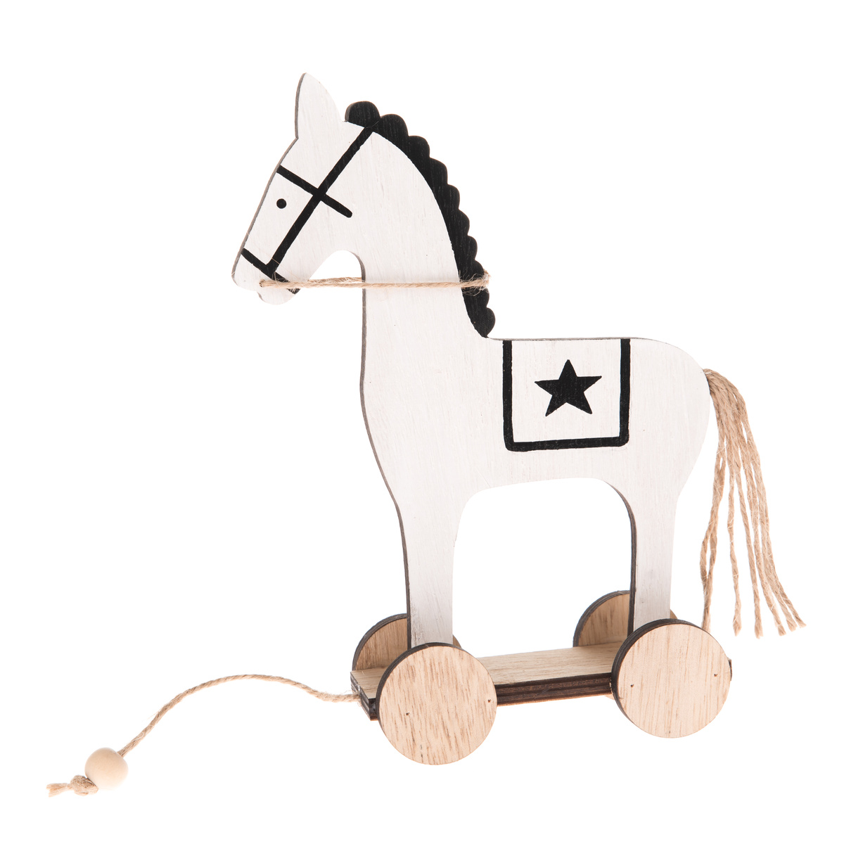 Dřevěný dekorativní koník na kolečkách je půvabným doplňkem, který do vašeho domova vnese jemný nádech nostalgie i přírodní elegance. Je vyroben z lehkého dřeva v přírodním a bílém tónu, což mu dodává nadčasový vzhled a umožňuje snadné sladění s jinými dekoracemi. Jednoduché černé linie zdůrazňují tvar koníka a sedlo je ozdobeno výraznou hvězdou, která dodává dekoraci hravý prvek.Koník stojí na čtyřech dřevěných kolečkách a díky provázku s korálkem jej lze snadno posouvat po povrchu. Ocásek z jutové šňůrky i tenké lanko kolem čumáčku působí autenticky a dodávají dekoraci ručně vyráběný charakter. Díky kvalitnímu zpracování je koník stabilní, pevný a vhodný k postavení na polici, komodu, dětskou knihovnu nebo k začlenění do zimních či celoročních aranžmá.Hlavní výhody produktu elegantní přírodní provedení z dřeva dekorativní a hravý design s hvězdou stabilní konstrukce na kolečkách provázkový ocásek a detaily s ručním dojmem ideální velikost pro police a komody snadné sladění s přírodními dekoracemiParametry a specifikace materiál: dřevo barva: přírodní, bílá, černá rozměry: 14 × 20 cm