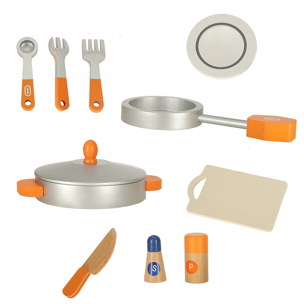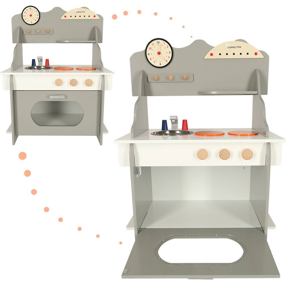Kuchyně jsou vybaveny dvěma hořáky, na které můžete umístit hrnce a pánve (s pokličkou). Dřevěná kuchyňka vám umožní vysvětlit vašemu dítěti nebezpečí hořáků bez rizika popálení.