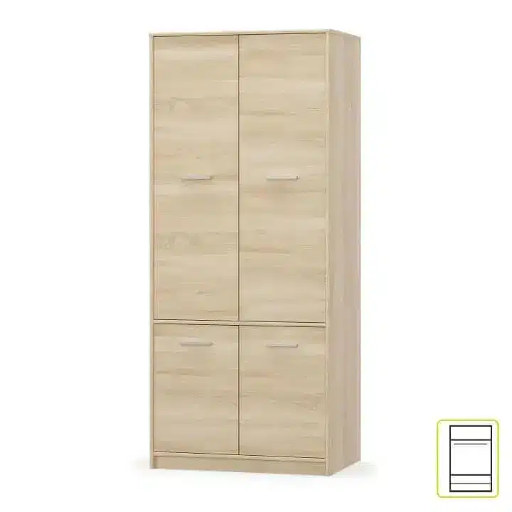 Věšáková skříň 4D s policemi ze sektorové moderní sestavy je vhodná na zařízení dětských nebo studentských pokojů. Je vyrobena z laminované dřevotřísky v barvě dub sonoma. Ve spodní části jsou dvě police, v horní části je šatní tyč. Dodáváno v demontu.