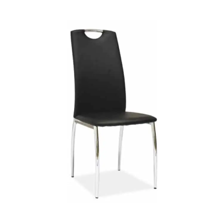 Moderní jídelní židle je velice elegantní díky jednoduchému tvaru. Nohy židle jsou kovové, chrom. Sedák a opěrák je čalouněný černou ekokůží. Jídelní židle je dodávána v demontu. Nabízíme možnost smontování. Jelikož jsou židle montované z několika komponentů, jejich určení je výhradně pro domácí interiéry a nejsou tudíž vhodné do společenských prostor.
