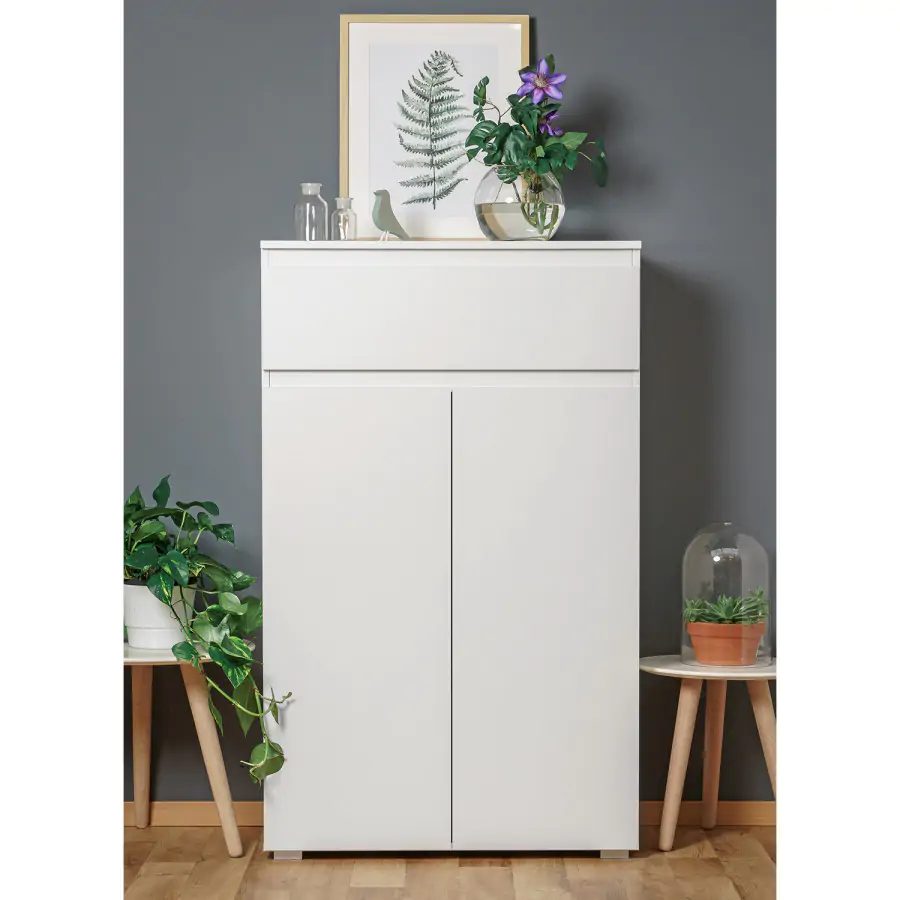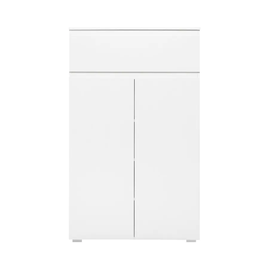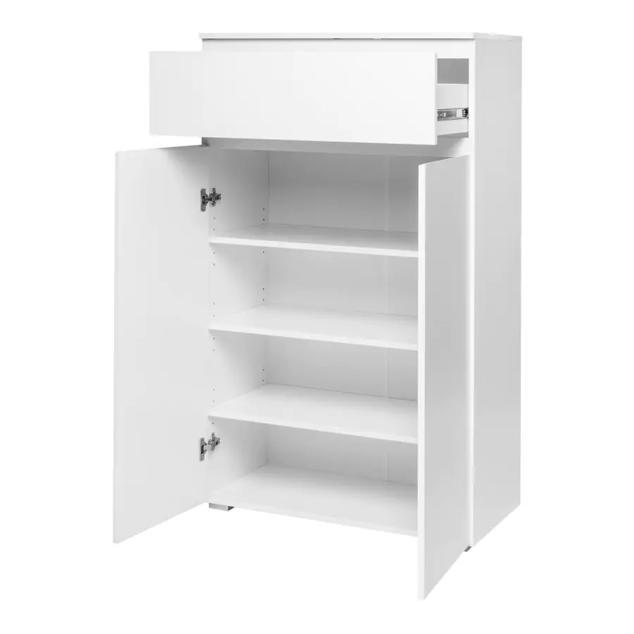 Botník IMAGE 3 je elegantním kouskem nábytku. Bílá barva botníku dodává prostoru klidnou a svěží atmosféru. Dvoudveřový botník obsahuje tři variabilní police, na které poskládáte obuv různých rozměrů, třeba i vysoké kozačky či holínky. Bílý hladký botník má navíc ve vrchní části širokou zásuvku s kovovými pojezdy na klíče a doplňky. Botník je možné doplnit i o další produkty z nábytkové řady IMAGE. Dodáváno v demontu.