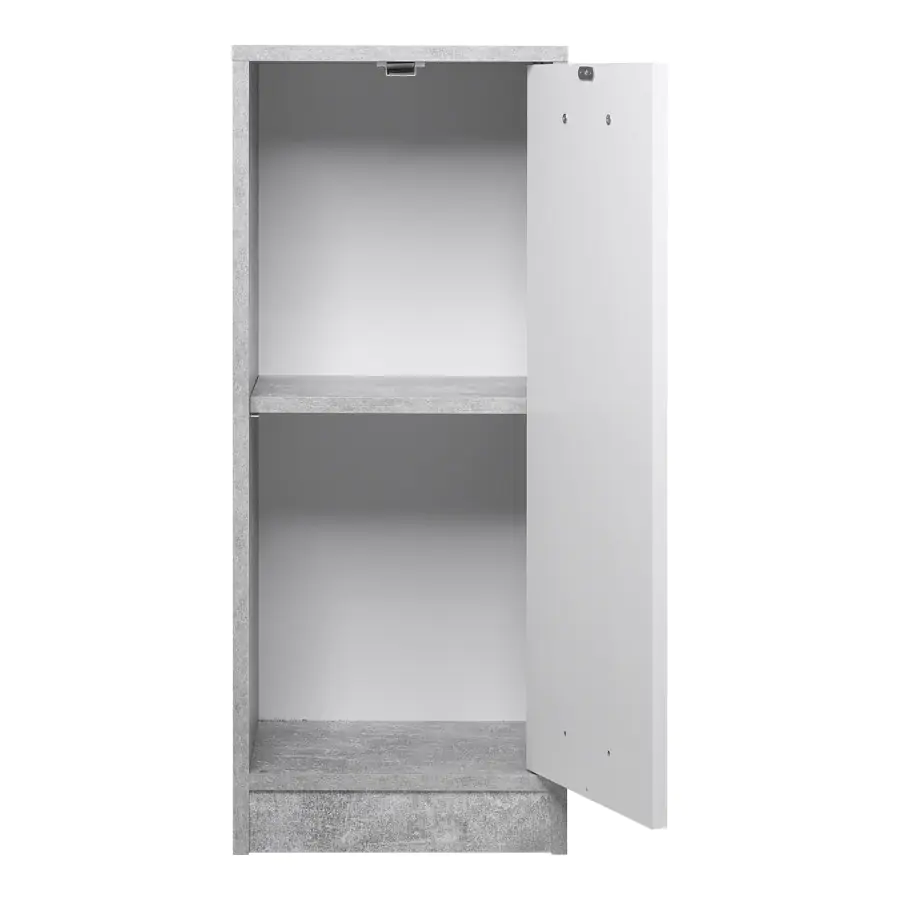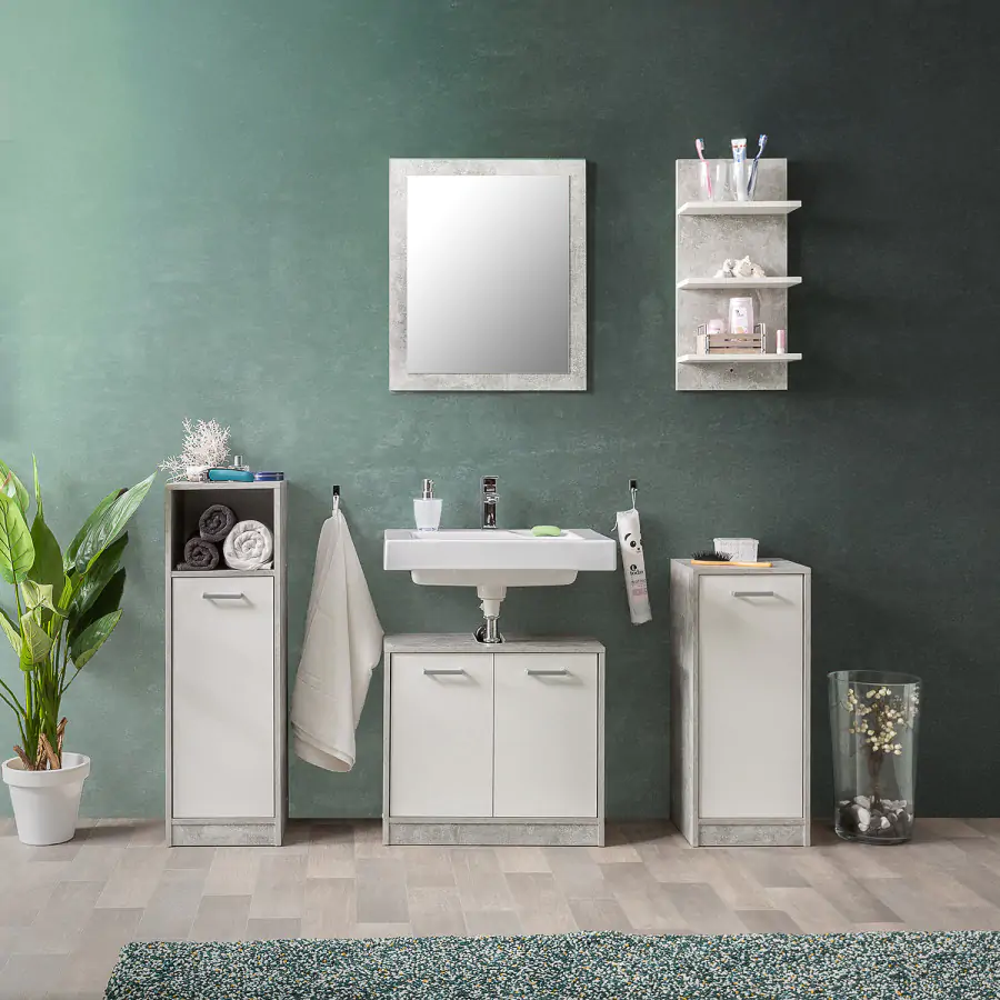 Představujeme vám naši praktickou koupelnovou sestavu MADEIRA v unikátním provedení beton/bílá. skříňka pod umyvadlo: 2 dvířka, rozměry (š/h/v) 60 × 28 × 55 cm skříňka: 1 dvířka, 1 police, rozměry (š/h/v) 31,5 × 28 × 76,5 cm skříňka s nikou: 1 dvířka, 1 police, nika, rozměry (š/h/v) 31,5 × 28 × 101 cm nástěnná polička: 3 police, rozměry (š/h/v) 31,5 × 15 × 68,5 cm Dodávané v demontu.