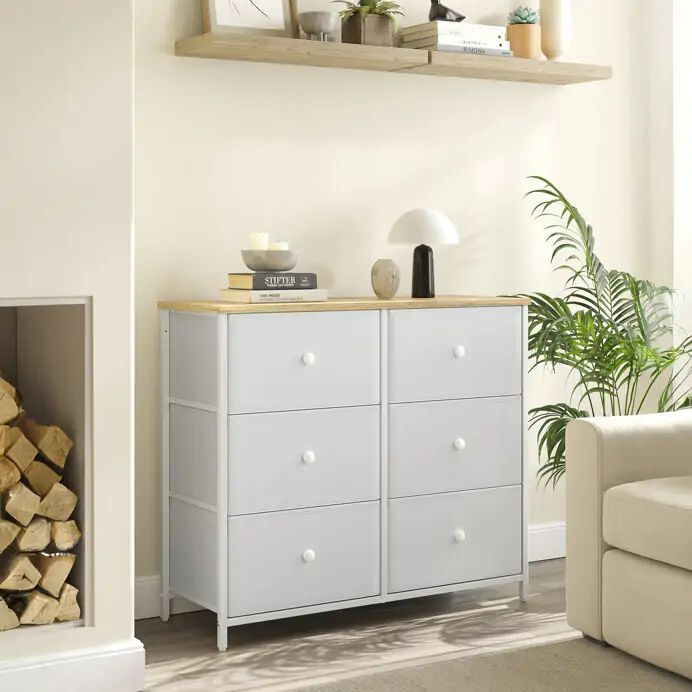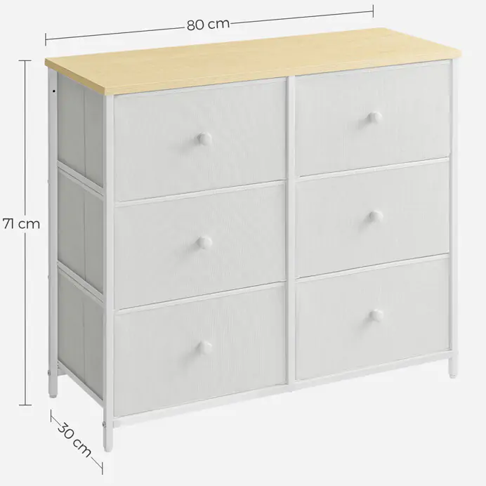 Regál/komoda AUK-E1032 WT o rozměrech 80x30x71 cm kombinuje pevnou kovovou konstrukci s matnou MDF deskou v dekoru dub, která dodává nábytku přírodní vzhled. Šest prostorných zásuvek z netkané textilie nabízí praktický úložný prostor pro různé drobnosti a zároveň usnadňují organizaci. Kovové nohy zajišťují stabilitu a dlouhou životnost, zatímco lehký materiál zásuvek přispívá k snadné manipulaci. Matný povrch desky je odolný vůči běžnému opotřebení a snadno se udržuje. Komoda je vhodná do moderních i minimalistických interiérů, kde oceníte funkčnost i jednoduchý design. Dodávané v demontu.