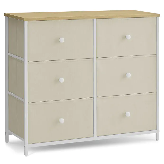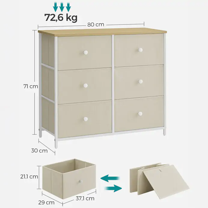 Regál/komoda AUK-E1033 WT o rozměrech 80x30x71 cm kombinuje pevnou MDF desku s dubovým dekorem a matnou povrchovou úpravou s robustním kovovým rámem a nohami v bílé barvě. Šest prostorných zásuvek z netkané textilie v béžovém odstínu nabízí praktický úložný prostor pro různé drobnosti a zároveň přispívají k lehkému a vzdušnému vzhledu komody. Kovová konstrukce zajišťuje stabilitu a dlouhou životnost, zatímco MDF deska je snadno udržovatelná a odolná vůči běžnému opotřebení. Komoda je vhodná do moderních i minimalistických interiérů, kde oceníte její funkčnost i nenápadný design. Dodávané v demontu.