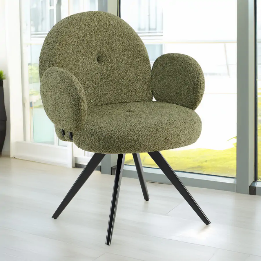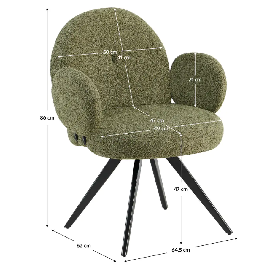 Stylová otočná židle VASALA okouzlí každého milovníka moderního designu! Čalouněná je látkou Bouclé v elegantním zeleném odstínu, který vnese do vašeho interiéru nádech přírody a harmonie. Černé kovové nohy vytvářejí poutavý kontrast se zeleným potahem a dodávají židli moderní vzhled. Otočný mechanismus zajišťuje maximální flexibilitu, ať už při práci, relaxaci nebo setkáních s přáteli. Rozměry (ŠxHxV): 64,5x62x86 cm Výška sedu: 47 cm Hloubka sedu: 47 cm Šířka sedu: 49 cm Šířka zad: 50 cm Výška zad: 41 cm Nosnost na osobu: 100 kg VASALA spojuje nadčasový styl s praktičností, skvěle se hodí do obýváku, pracovny nebo domácí kanceláře. Dopřejte si pohodlí a jedinečný šarm s touto otočnou židlí, která okamžitě přitáhne pozornost! Dodávána v demontu.