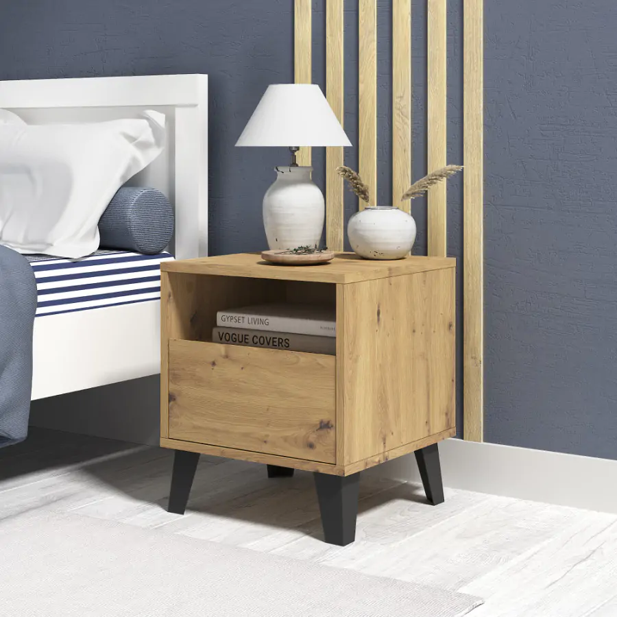 Noční stolek BOGAN NEW 1S nabízí úložný prostor v podobě jednoho šuplíku a otevřeného úložného prostoru. Na stylovém vzhledu se podepisují černé nožičky. Materiál: laminovaná DTD Barva: dub artisan Rozměry (ŠxHxV): 40x38,8x45,6 cm Výška spodního prostoru od podlahy: 12 cm 1 šuplík Rozměr šuplíku (ŠxV): 36,2x18 cm Výška otevřeného prostoru: 12,4 cm Nosnost šuplíku a police: 5 kg Nosnost vrchní desky: 15 kg Dodáváno v demontu.
