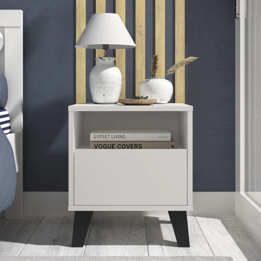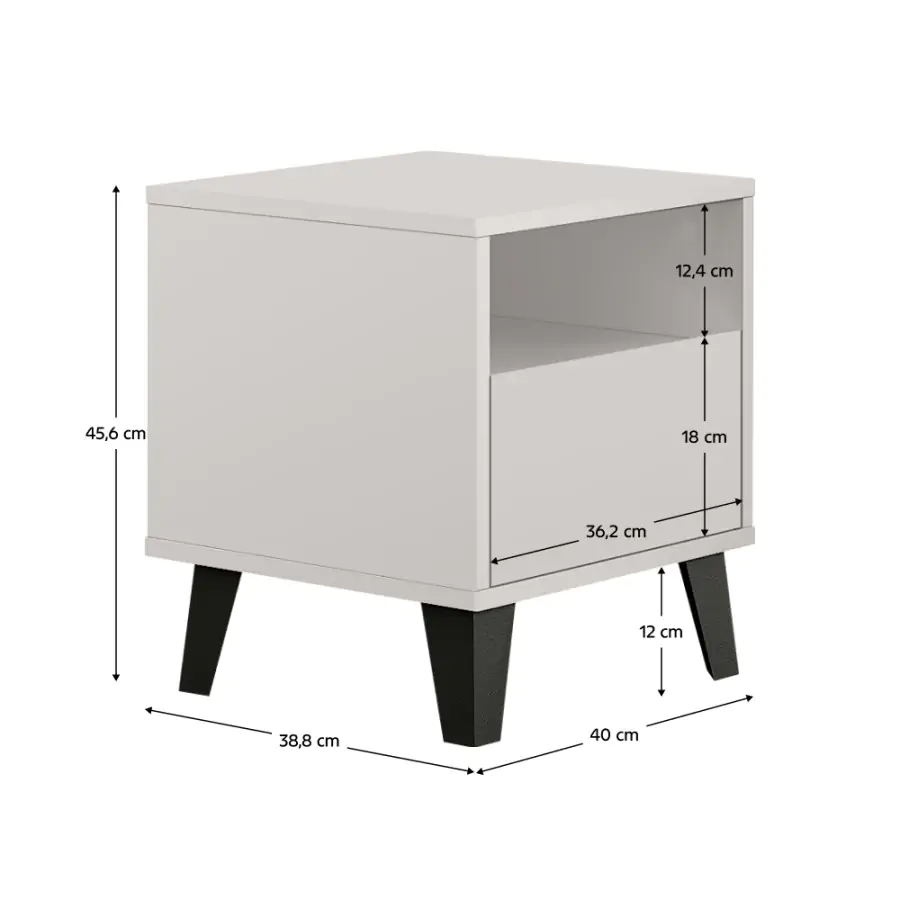 Noční stolek BOGAN NEW 1S nabízí úložný prostor v podobě jednoho šuplíku a otevřeného úložného prostoru. Na stylovém vzhledu se podepisují černé nožičky. Materiál: laminovaná DTD Barva: kašmír Rozměry (ŠxHxV): 40x38,8x45,6 cm Výška spodního prostoru od podlahy: 12 cm Rozměr šuplíku (ŠxV): 36,2x18 cm Výška otevřeného prostoru: 12,4 cm Nosnost šuplíku a police: 5 kg Nosnost vrchní desky: 15 kg Dodáváno v demontu.