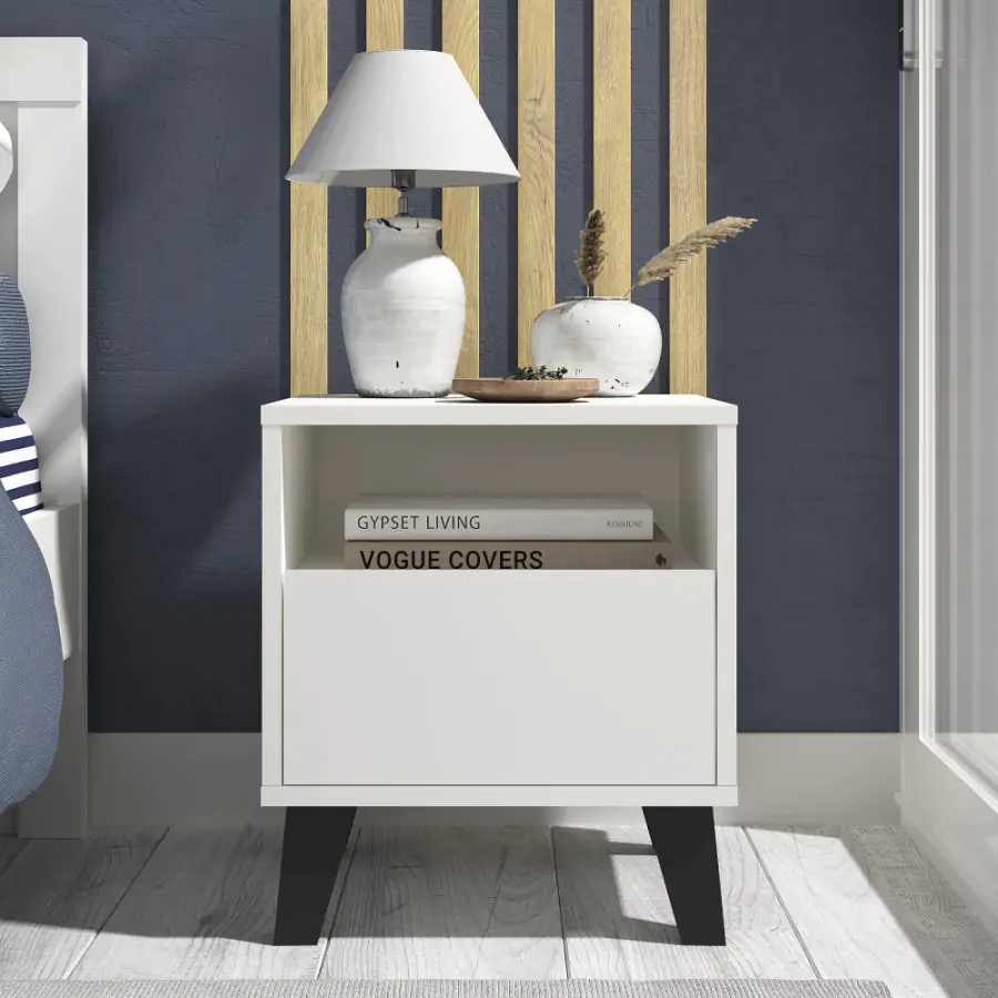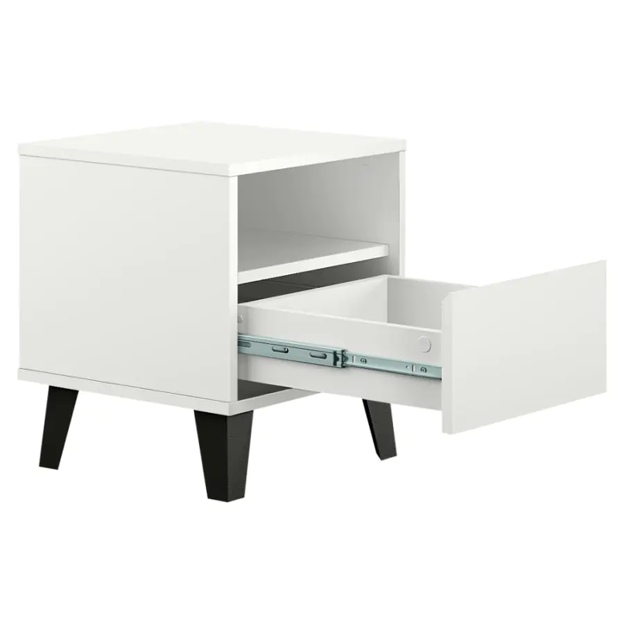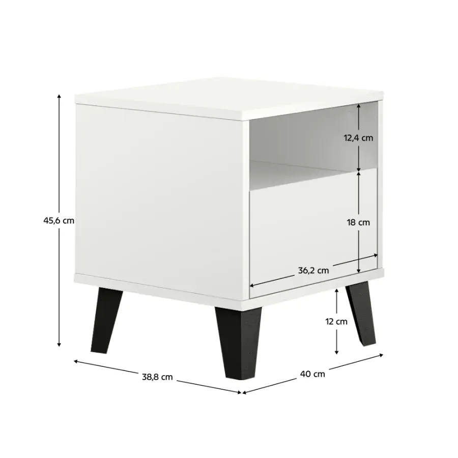 Praktické a stylové řešení pro všechny, kdo hledají elegantní kousek nábytku do svého domova v podání nočního stolku ze série BOGAN NEW. Tvoří nedílnou součást téměř každé postele. Vhodný do ložnice, dětského nebo studentského pokoje. Vyroben v nadčasovém designu z laminované dřevotřísky v bílém provedení. Noční stolek BOGAN NEW 1S nabízí úložný prostor v podobě jednoho šuplíku a otevřeného úložného prostoru. Na stylovém vzhledu se podepisují černé nožičky. Rozměry (ŠxHxV): 40x38,8x45,6 cm Výška spodního prostoru od podlahy: 12 cm Rozměr šuplíku (ŠxV): 36,2x18 cm Výška otevřeného prostoru: 12,4 cm Nosnost šuplíku a police: 5 kg Nosnost vrchní desky: 15 kg Dodáváno v demontu.