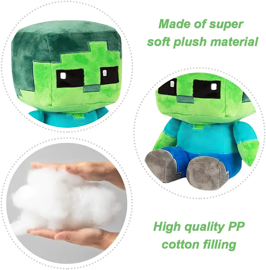 Vstupte do světa Minecraftu s plyšovým baby zombie Stevem v roztomilé hranaté měkké dětské podobě. Tato hračka přináší do vašeho domova ikonickou postavičku z jednoho z nejoblíbenějších videoherních světů. Naše plyšová hračka Stevea v jeho zombií podobě je ztvárněna s humorem a roztomilostí. Vaše dítě si s ní může vytvořit vlastní dobrodružství v Minecraftovém světě, kde narazí na nečekané překážky i nové přátele. Zombie Steve má typický zelený odstín pokožky, tmavé oči a často nosí stejné modré kalhoty a světle modré tričko jako klasický Steve. Zombie Steve je citlivý na sluneční světlo. Když je vystaven přímému slunečnímu záření, začne hořet a utrpí poškození, dokud není úplně zničen. Zombie Steve je zajímavou a nebezpečnou variantou klasického Stevea, která přidává do hry další vrstvu výzvy a napětí. Hračka je vyrobena z vysoce kvalitních a bezpečných materiálů, což zajišťuje její dlouhou životnost a bezpečnost pro vaše dítě. Tento plyšák bude skvělým společníkem pro hraní a zároveň působivým dekoračním prvkem v dětském pokoji. Dítě může využít vlastnosti této postavičky z minecraftového prostředí a vytvořit originální hru s použitím vlastní fantazie a svého plyšového kamaráda. Doporučeno pro děti od 3 let. Rozměry 20 x 16 x 13 cm (v x š x h) Materiál látka
