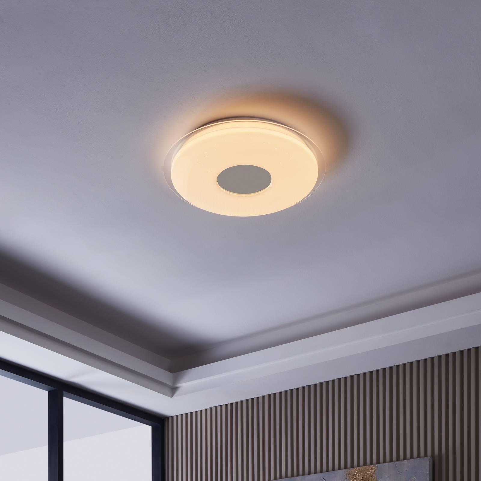 S křišťálovým efektem - stropní svítidlo Lanciano-Z LED, chytře ovladatelné Jiskřivé a funkční - moderní stropní svítidlo Lanciano-Z LED poskytuje všestranné a funkční světlo. Skládá se z plastového difuzoru s lehkým křišťálovým efektem, který vytváří zvláštní atmosféru. Integrované LED diody mohou měnit barvu světla od teplé bílé až po denní světlo a jsou ovládány pomocí aplikace, hlasového ovládání nebo klasickým dálkovým ovladačem (viz příslušenství). Díky použité technologii je možné stropní svítidlo Lanciano-Z LED integrovat i do stávajících kompatibilních systémů chytré domácnosti od jiných výrobců, které využívají ZigBee 3.0. Funkce / kompatibilita: - ovladatelné pomocí bezplatné aplikace AwoX HomeControl - kompatibilní se systémy chytré domácnosti od jiných výrobců, které využívají ZigBee 3.0. Funkce / kompatibilita: - ovladatelné pomocí bezplatné aplikace AwoX HomeControl - kompatibilní se systémy chytré domácnosti od jiných výrobců, které využívají ZigBee 3.0.0 - možnost přímého propojení s Amazon Echo a Google Home - zvýšený dosah díky přídavné síti Bluetooth - kompatibilní se všemi položkami řady EGLO connect-c Bluetooth - ovladatelné vhodným dálkovým ovladačem i bez přístupu k internetu (viz příslušenství)