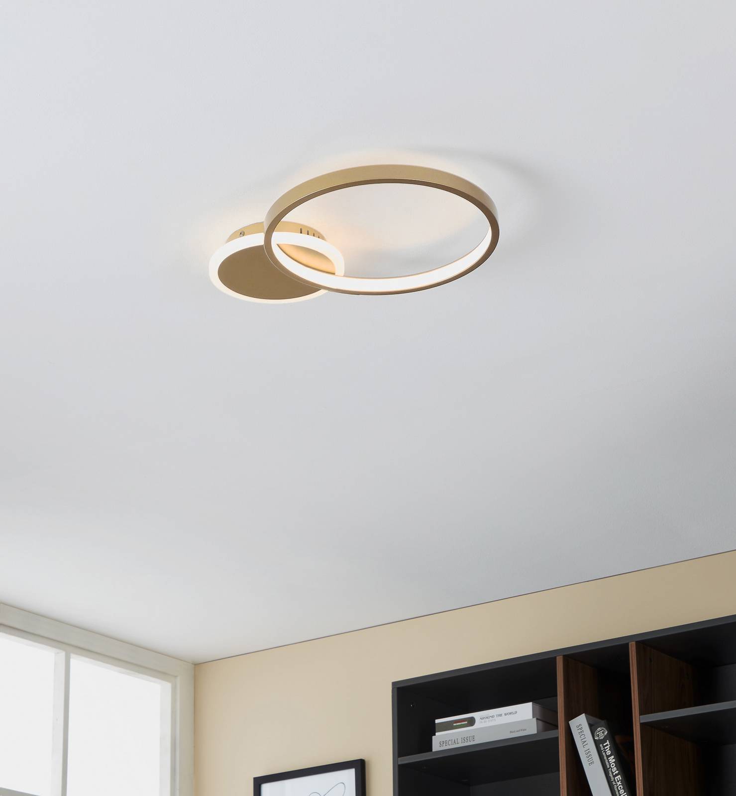 Stropní svítidlo Gafares LED: elegance se snoubí s všestranným ovládáním osvětlení Stropní svítidlo Gafares LED v elegantní zlaté barvě kombinuje moderní design s inovativní technologií osvětlení. Toto svítidlo je vyrobeno z vysoce kvalitního hliníku, oceli a plastu a nabízí nejen atraktivní vzhled, ale také odolnost a stabilitu. Integrovaný světelný zdroj LED poskytuje energeticky úsporné osvětlení, které lze flexibilně regulovat pomocí funkce CCT. Díky barevné teplotě od teplé bílé (3 000 K) po denní světlo (6 500 K) se svítidlo dokonale přizpůsobí různým náladám a požadavkům v obývacích pokojích, chodbách, kuchyních a jídelnách. Zvláštností svítidla Gafares je dálkové ovládání, které je součástí dodávky a které usnadňuje ovládání intenzity světla. Stmívatelnost lze pohodlně nastavit pomocí přiloženého stmívače a vytvořit tak požadovanou atmosféru. Díky věrnosti barev 80 Ra zajišťuje svítidlo přirozené podání barev, které zalévá každou místnost příjemným světlem. Stropní svítidlo Gafares LED je proto ideální volbou pro každého, kdo ocení stylové a funkční osvětlení. Ovládání pomocí přiloženého dálkového ovladače: možnost volby teplého bílého, neutrálního bílého a denního bílého světla, stmívání, nočního osvětlení a funkce časovače (vypne se po 30 minutách).