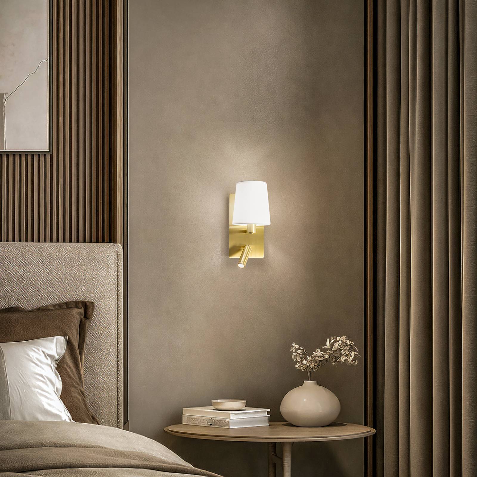 Nástěnná lampa Aiden v mosazné barvě s válcovým LED světlem na čtení a bílým látkovým stínidlem Tato látková nástěnná lampa se dobře hodí do ložnice vedle postele a nabízí výhody dvou různých zdrojů světla. Bílé látkové stínidlo vytváří útulné, rovnoměrné a neoslňující světlo, které vám pomůže relaxovat, zatímco válcové světlo na čtení je vybaveno diodou LED a vytváří bodové světlo s dobrou svítivostí, které optimálně uleví očím při čtení. Nástěnné svítidlo lze také snadno instalovat za pohovku v obývacím pokoji a jeho výhodou je, že má dva samostatné vypínače, takže můžete zapnout obě svítidla nebo jen jedno z nich. Povrch kovového rámu je v matném mosazném odstínu a umocňuje klasický vzhled nástěnného svítidla, které lze použít i komerčně v hotelech. Světlo na čtení: - teplá bílá (3 000 K) - 210 lumenů