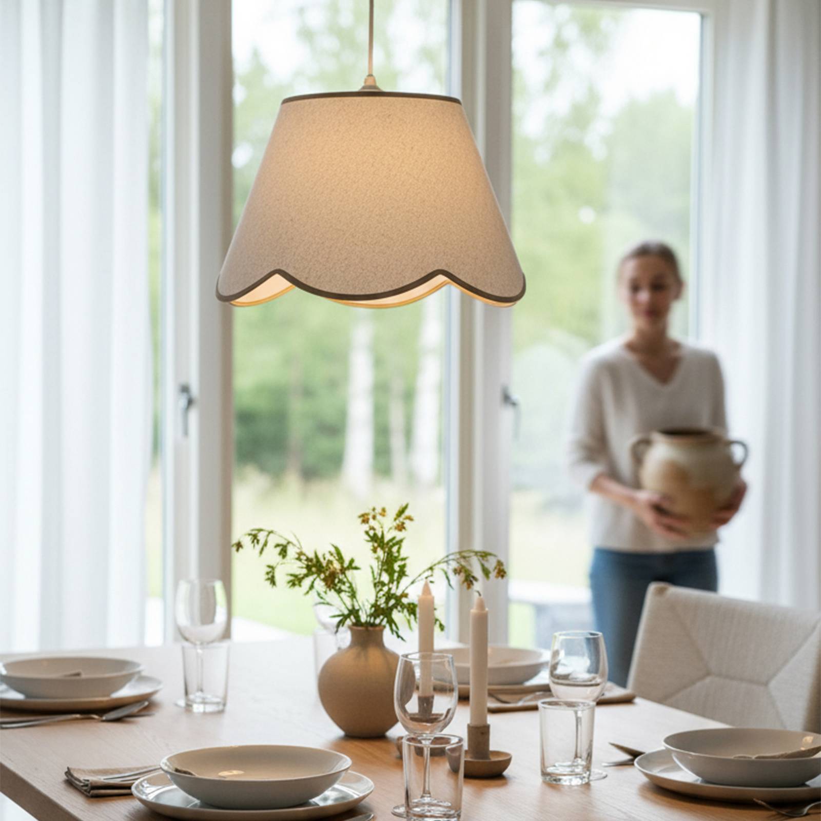 Závěsné světlo Nell – elegance z látky pro stylové obytné prostory Závěsné světlo Nell od PR Home spojuje nadčasovou eleganci s vysoce kvalitním látkovým designem. Harmonické barevné provedení stínidla na lampu v bílé barvě s béžovým zvlněným okrajem se dokonale hodí do různých obytných konceptů a vytváří příjemnou atmosféru. Látkové stínidlo zajišťuje měkké rozptýlení světla, které prostory zalévá teplým a příjemným světlem. Díky možnosti ovládání svítidla pomocí externího stmívače lze intenzitu světla individuálně přizpůsobit – ideální pro obývací pokoje nebo jídelny. Kombinace estetického designu a funkčnosti činí z tohoto svítidla univerzální highlight pro náročné Raumgestalt.