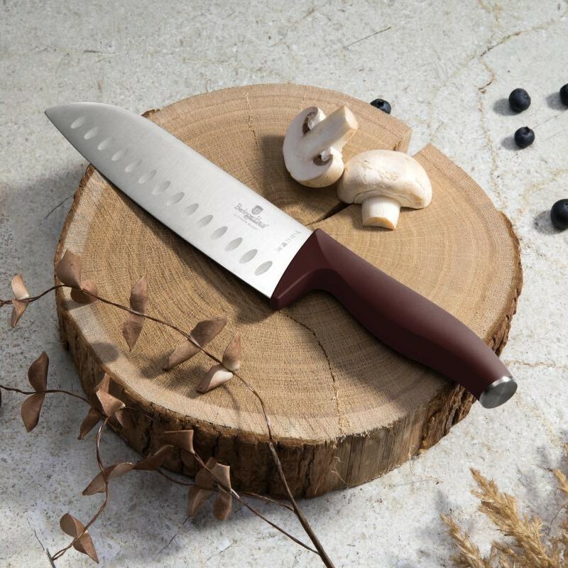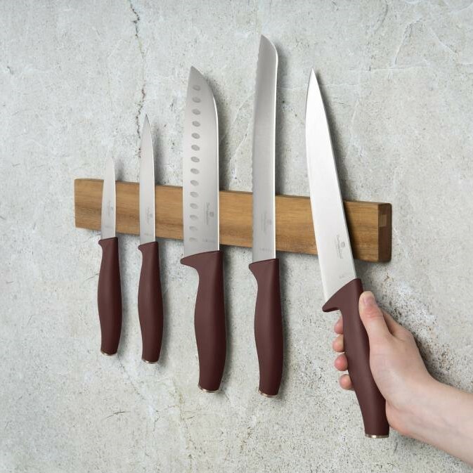 Sada nožů s akátovým magnetickým držákem Leonardo od značky BerlingerHaus spojuje špičkovou kvalitu, moderní design a praktické uložení v jednom. Čepele z vysoce kvalitní nerezové oceli jsou tepelně ošetřené pro maximální odolnost a dlouhou životnost. Ruční broušení zaručujeprecizní ostří, které si poradí s každým druhem potravin, od křupavého pečiva až po jemnou zeleninu.Elegantní matné bordeaux rukojeti s měkkým povrchem skvěle padnou do ruky, poskytují pohodlný úchop a bezpečné ovládání. Součástí je magnetická lišta z akátového dřeva o rozměrech 38 × 5 × 2 cm, která zajistí přehledné, stylové a hygienické uložení nožů přímo na dosah. Tento přírodní prvek dokonale ladí s moderním i rustikálním stylem kuchyně.Sada obsahuje pět nožů pro různé kulinářské úkoly – šéfkuchařský, na chléb, santoku, univerzální a loupací – takže pokryje všechny běžné potřeby při vaření. Je ideální pro domácí kuchaře i pro náročnější kulinární nadšence a skvěle poslouží také jako prémiový dárek. Nože doporučuje mýt ručně. Hlavní výhody produktu: vysoce kvalitní nerezová ocel pro dlouhou životnost a odolnost ručně broušené ostří pro přesný a čistý řez ergonomické rukojeti s měkkým povrchem pro pohodlné držení magnetická akátová lišta pro stylové a hygienické uložení elegantní matná bordeaux barva pro moderní vzhled kuchyněObsah balení: 1x šéfkuchařský nůž 20 cm 1x nůž na chléb 20 cm 1x santoku nůž 17,5 cm 1x univerzální nůž 12,5 cm 1x loupací nůž 9 cm 1x magnetická lišta z akátového dřeva 38 × 5 × 2 cm