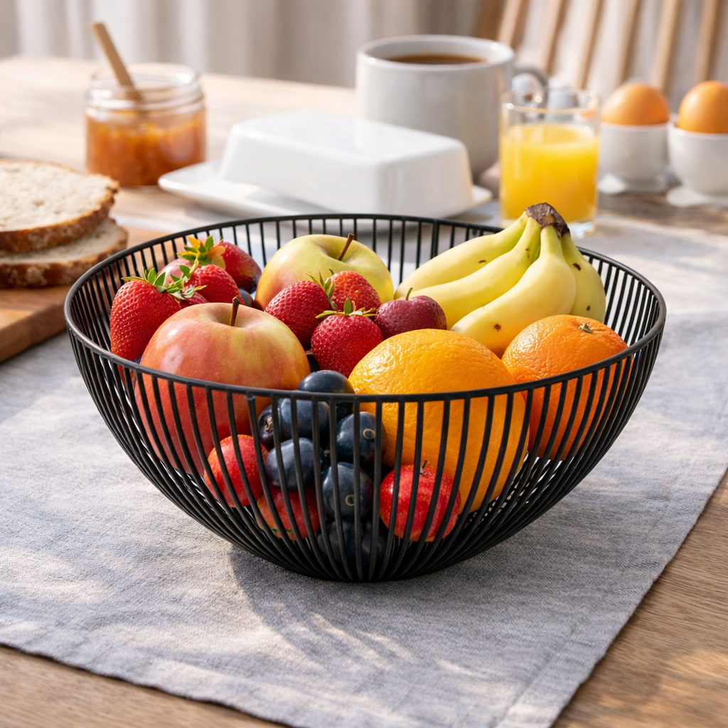 Drátěná mísa na ovoce s jednoduchým elegantním vzhledem je praktický doplněk do každé domácnosti s mnohostranným využitím pro skladování ovoce i jako dekorace. Parametry: průměr: 25 cm průměr dna: 9,5 cm výška mísy: 14,5 cm umožnuje cirkulaci vzduchu uchová ovoce déle čerstvé Materiál:lakovaný kovový drátVýhodou drátěných mís je to, že jsou otevřené a vzdušné a ovoce v nich rozložené se brzy nekazí. Nerezové misky s plným dnem se dají použít zase na malé ovoce jako třešně, višně, rybíz nebo angrešt a mimo sezonu poslouží na cukrovinky nebo jiné dobroty.Mísa s ovocem na stole může být navíc dobrý způsob, jak se přinutit mlsat zdravě.