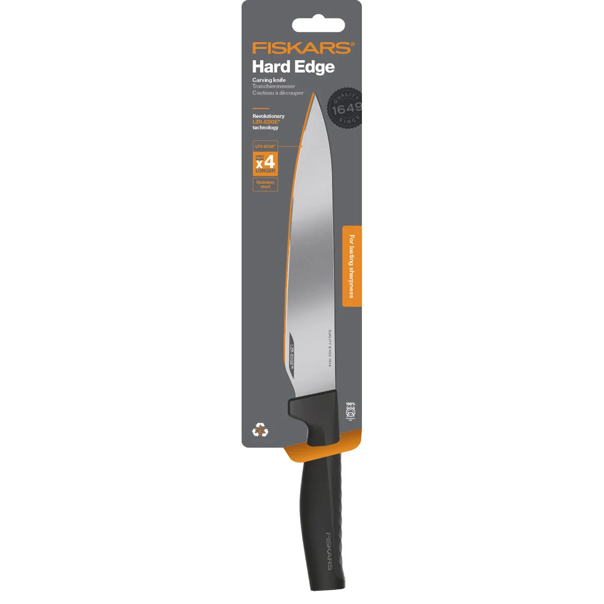 Nůž Hard Edge s dlouhou rovnou čepelí a hladkým ostřím se používá k porcování větších kusů masa, ale také ke krájení syrového i pečeného masa. Využijete ho při krájení šunky, salámů a jiných uzenin, můžete s ním však nakrájet třeba i meloun či ananas. Pevná a perfektně ostrá čepel porcovacího nože Fiskars Hard Edge je 22 cm dlouhá a poměrně široká.Čepel nože Fiskars Hard Edge je vyrobena z pevné nerezové oceli a ostřena pomocí speciální technologie LZR-EDGE™. Díky této úpravě nože zůstávají 4x déle ostré než jiné nože. Skvěle ergonomická střenka nože Hard Edge je pokryta materiálem Softouch™ s trojrozměrným vzorem na povrchu, který zaručuje bezpečné a pohodlné držení. Nůž se snadno udržuje, je možné ho mýt v myčce nádobí. V případě potřeby ho lze snadno nabrousit ostřičem či ocílkou.