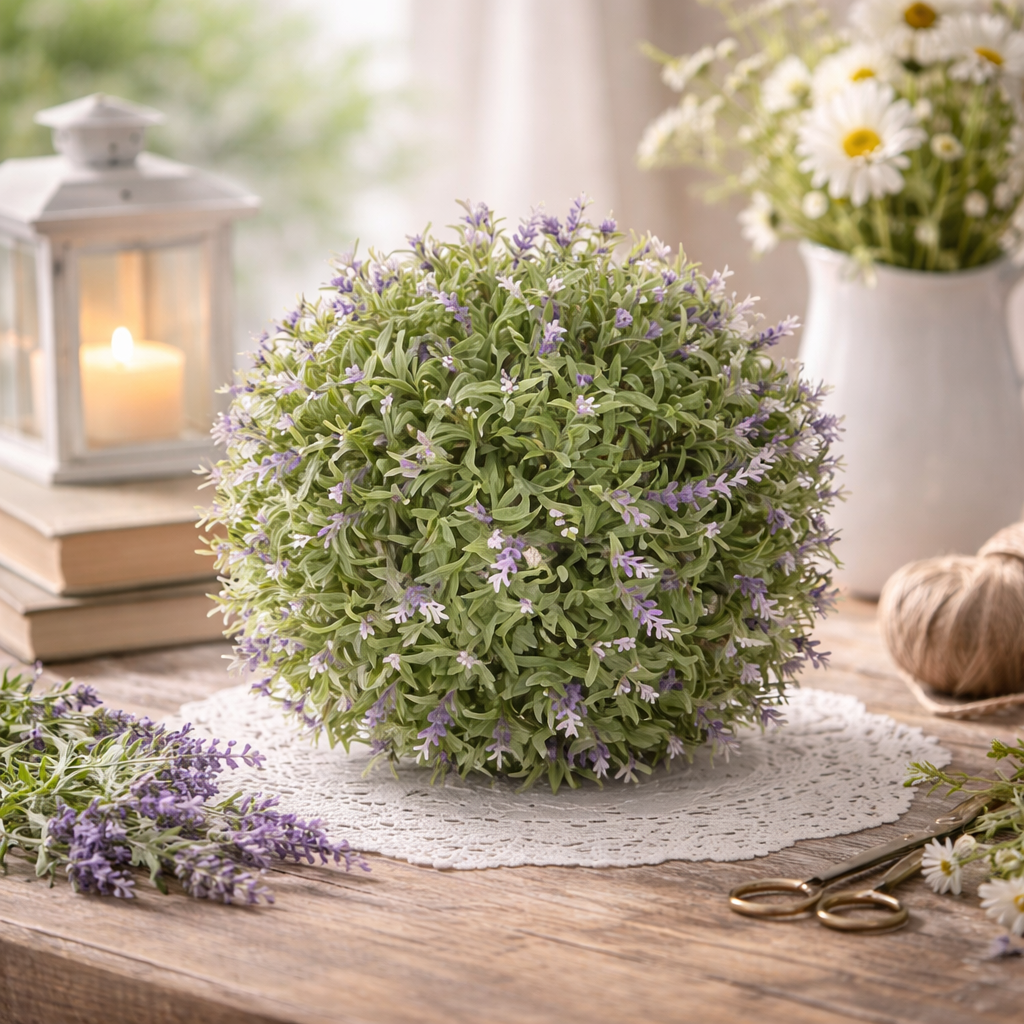 Kvalitně zpracovaná dekorace ve tvaru koule z rozkvetlé levandule je krásnou dekorací pro každý interiér i exteriér. Dekoraci můžete zavěsit do okna, na trám v pergole nebo vsadit do květináče. Jednotlivé lístky a květy jsou pěkně zpracované a věrně imitují živou levanduli.