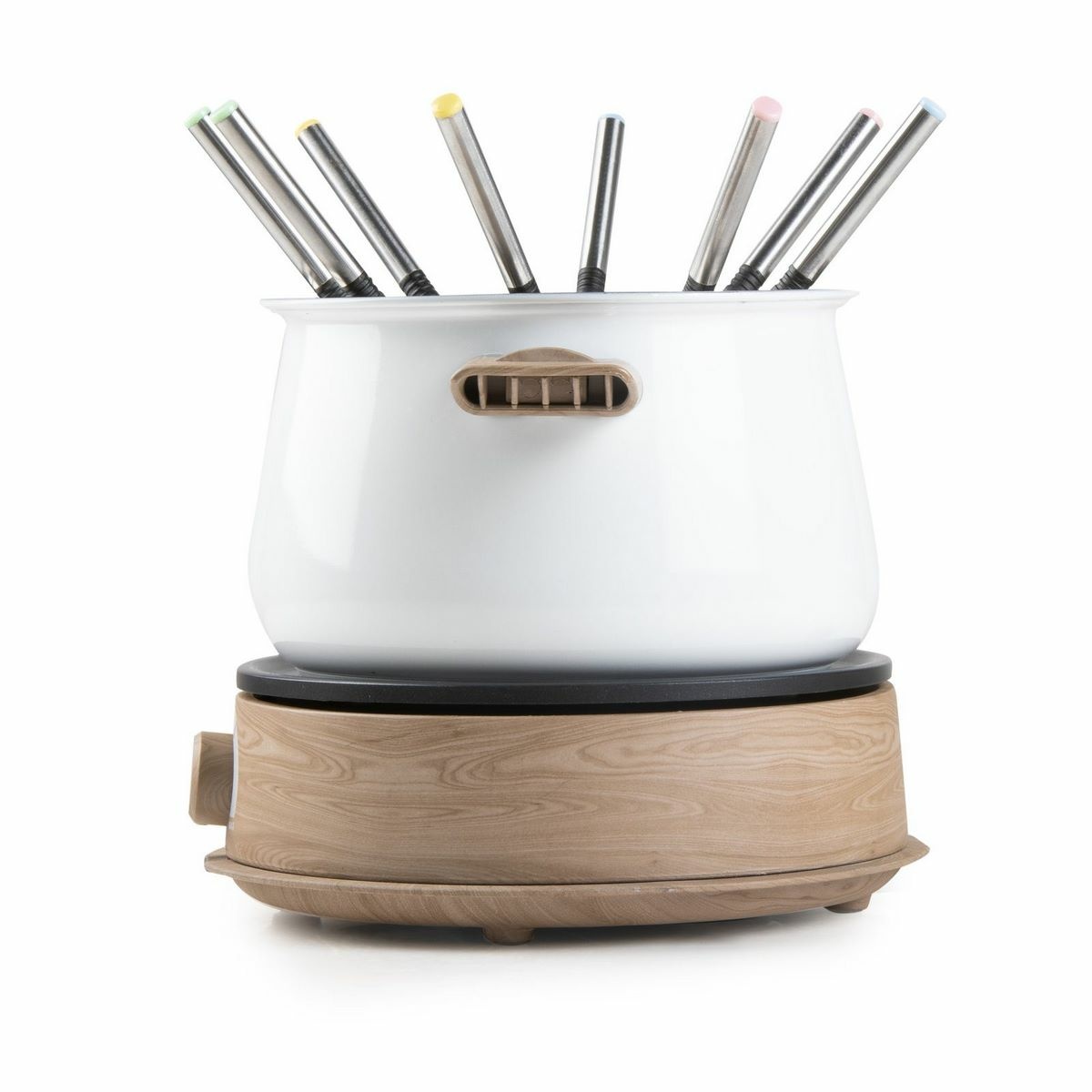 DOMO DO736F fondue set je stylový a praktický set pro společné stolování, který promění každý večer v příjemný kulinářský zážitek. Elegantní podstavec a rukojeti v dřevěném vzhledu dodávají fondue nadčasový charakter a přirozeně zapadnou do moderního i klasického interiéru.Fondue je navrženo až pro 8 osob a disponuje nerezovou nádobou o objemu 1,4 litru, která je ideální pro sýrové, masové i čokoládové fondue. Vysoký příkon 1500 W zajišťuje rychlý ohřev, zatímco nastavitelný termostat s kontrolkou umožňuje přesnou regulaci teploty, takže se jídlo udržuje stále v ideálním stavu bez zbytečného čekání.Součástí balení je 8 nerezových vidliček s barevným označením, díky nimž má každý stolovník svou vlastní vidličku. Rukojeti, které se nezahřívají, zvyšují bezpečnost při používání. Stabilitu na stole zajišťují protiskluzové nožičky, praktický je také úložný prostor pro kabel, který usnadňuje skladování po skončení hostiny.Údržba je velmi jednoduchá – nerezovou nádobu, držák i vidličky lze mýt v myčce nádobí. Fondue set DOMO DO736F je ideální volbou pro rodinná setkání, oslavy i pohodové večery s přáteli.Příslušenství v balení 8× nerezová fondue vidlička s barevným označením fondue prstenec