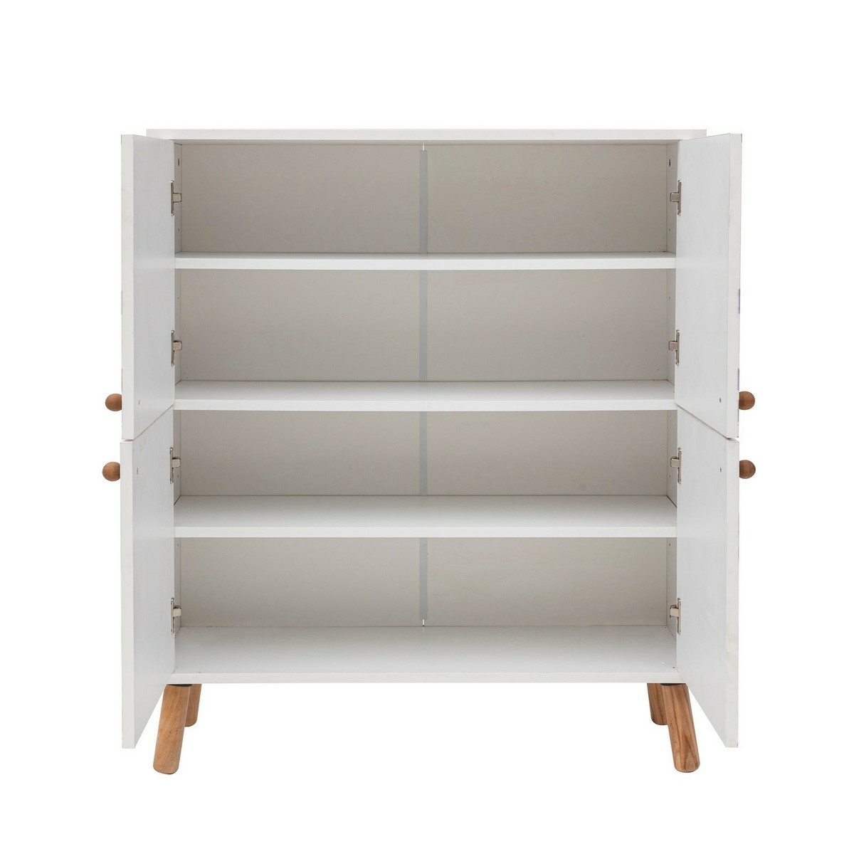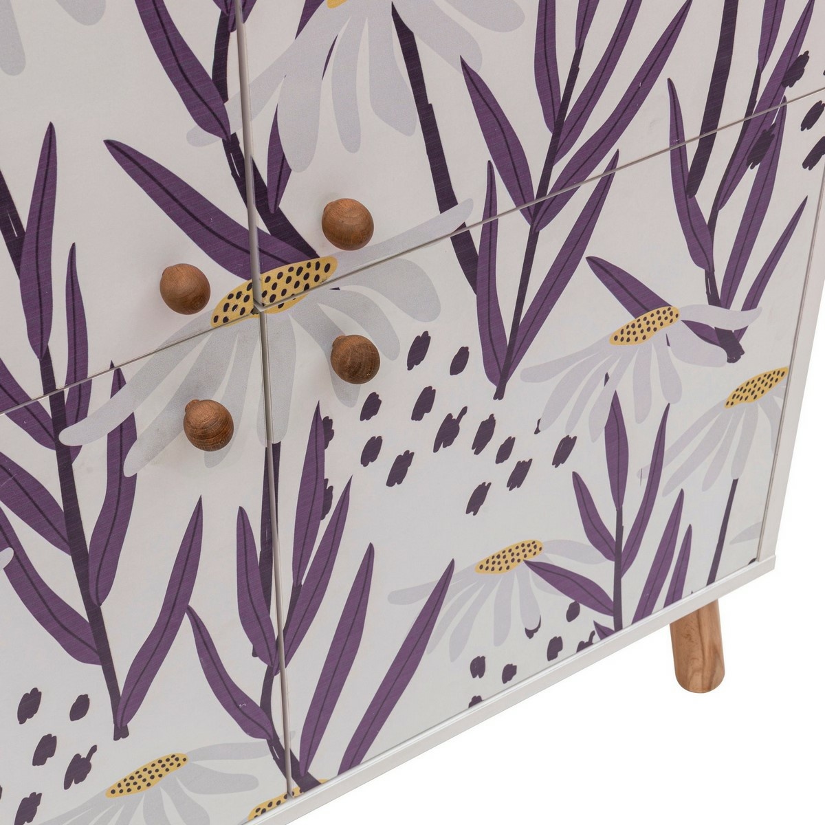 Skříňka Daisy White and Lila je stylový a praktický kus nábytku, který zaujme výrazným dekorativním motivem v odstínech bílé a fialové. Nabízí přehledné uspořádání úložného prostoru díky vnitřním policím, zatímco pevná melaminovaná deska o tloušťce 18 mm zajišťuje stabilitu a dlouhou životnost. Skříňka stojí na dřevěných nohách, které dodávají lehkost a moderní vzhled. Je ideální do obývacího pokoje, ložnice či předsíně, kde kromě praktičnosti přinese i dekorativní prvek.Parametry produktu materiál: 100% melaminovaná dřevotříska tloušťka materiálu: 18 mm nohy: dřevěné povrchová úprava: UV ochranný nátěr rozměry: 95 × 111 × 36 cm (š × v × h) výška nohou: 15 cm výška polic: 19,8 cm barva: bílá / fialová (lila)