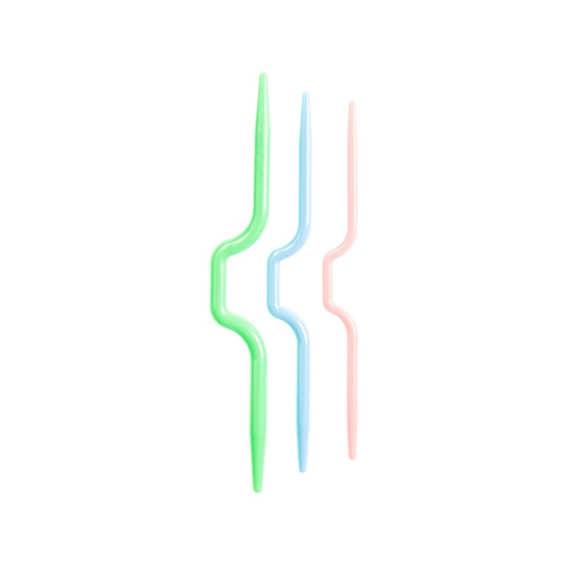 Plastové pomocné jehlice prohnuté. Na zajištění ok při pletení vzorů s křížením ok.