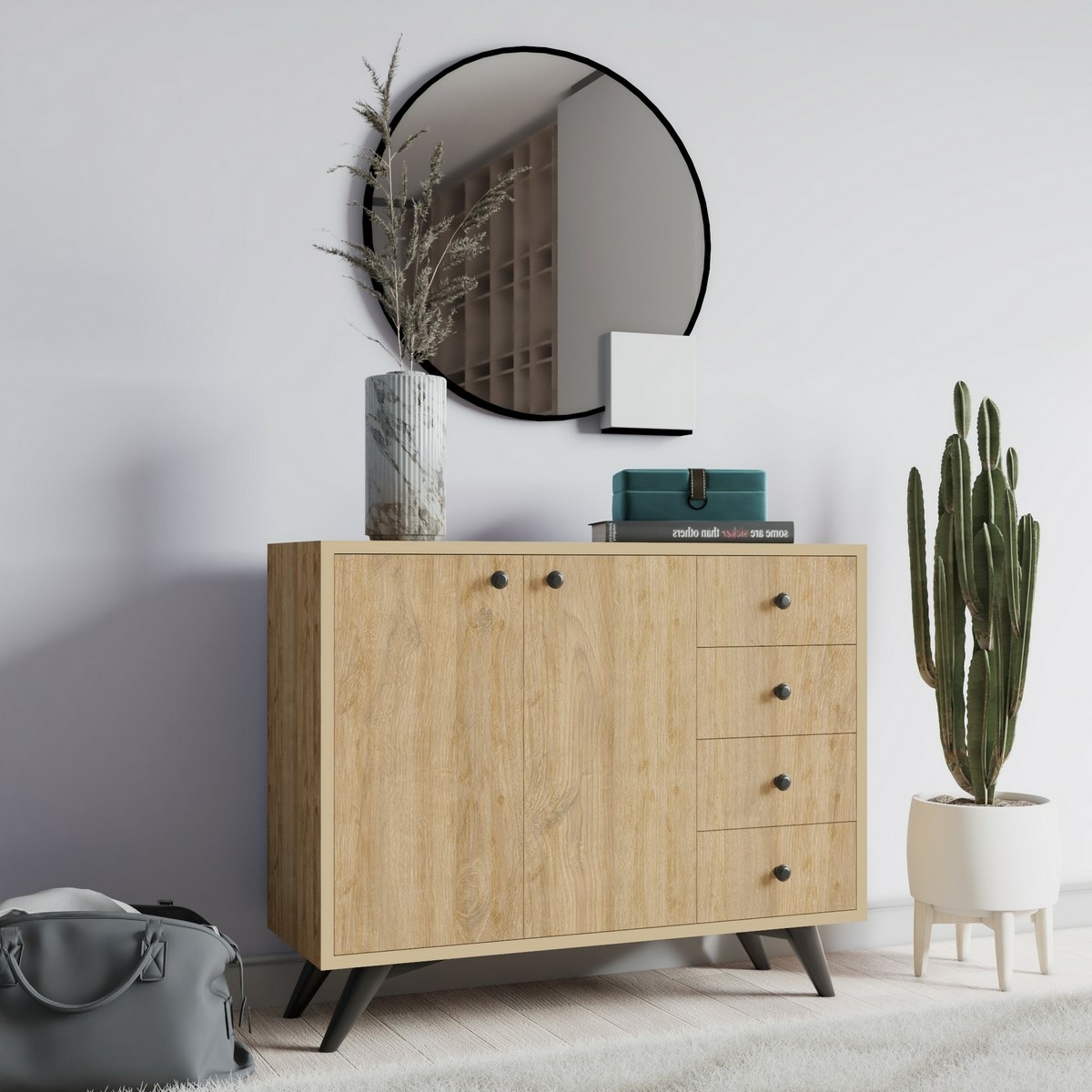 Skříňka Waga Oak je stylová a praktická komoda v dekoru dub, která díky svému modernímu provedení skvěle doplní obývací pokoj, ložnici, pracovnu i předsíň. Kombinuje dvířkovou skříňku s vnitřními policemi a čtyři zásuvky, které poskytují přehledné uložení dokumentů, textilu, doplňků i dekoračních předmětů. Kovové nohy dodávají nábytku stabilitu a lehce industriální charakter.Parametry produktu materiál: 100% melaminovaná dřevotříska tloušťka materiálu: 18 mm rozměry: 100 × 82 × 35 cm (š × v × h) úložný prostor: vnitřní police + 4 zásuvky možnost připevnění ke stěně: ano barva: dub