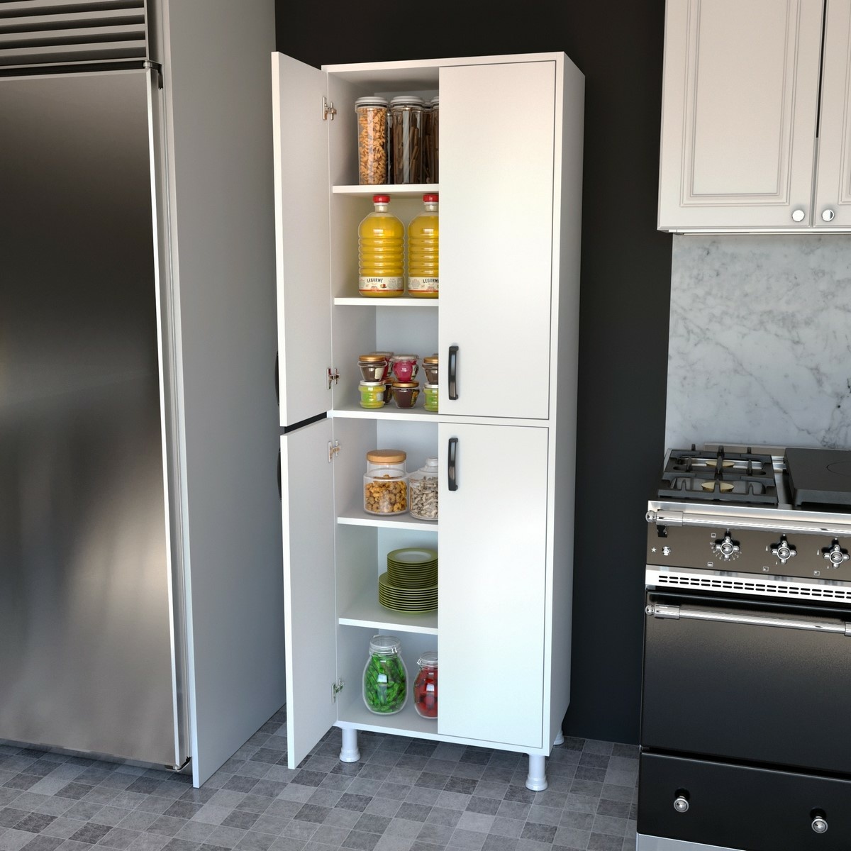 Skříňka Mily White je praktický a elegantní kus nábytku, který nabízí přehledné a organizované místo pro uložení všech domácích potřeb. Díky dvoukřídlému hornímu i spodnímu úložnému prostoru poskytuje dostatek místa pro textilie, čistící prostředky, potraviny, nádobí nebo další vybavení. Vysoká a úzká konstrukce šetří prostor a zároveň zajišťuje maximální využití vnitřních polic.Korpus je vyroben z melaminované dřevotřísové desky E1 o tloušťce 18 mm, která se vyznačuje stabilitou, odolností a snadnou údržbou. Bílé provedení působí čistě, moderně a univerzálně, díky čemuž se skříňka snadno začlení do kuchyně, spíže, koupelny nebo technické místnosti. Pro vyšší bezpečnost ji lze připevnit ke stěně a plastové nohy dodávají skříňce lehkost i potřebnou stabilitu.Parametry: materiál: 100% melaminovaná dřevotříska E1 tloušťka materiálu: 18 mm šířka: 62,6 cm výška: 191 cm hloubka: 35,8 cm výška police: 28 cm výška nohou: 10 cm barevné provedení: bílá uzavřený horní i dolní úložný prostor, vnitřní police, možnost připevnění ke stěně