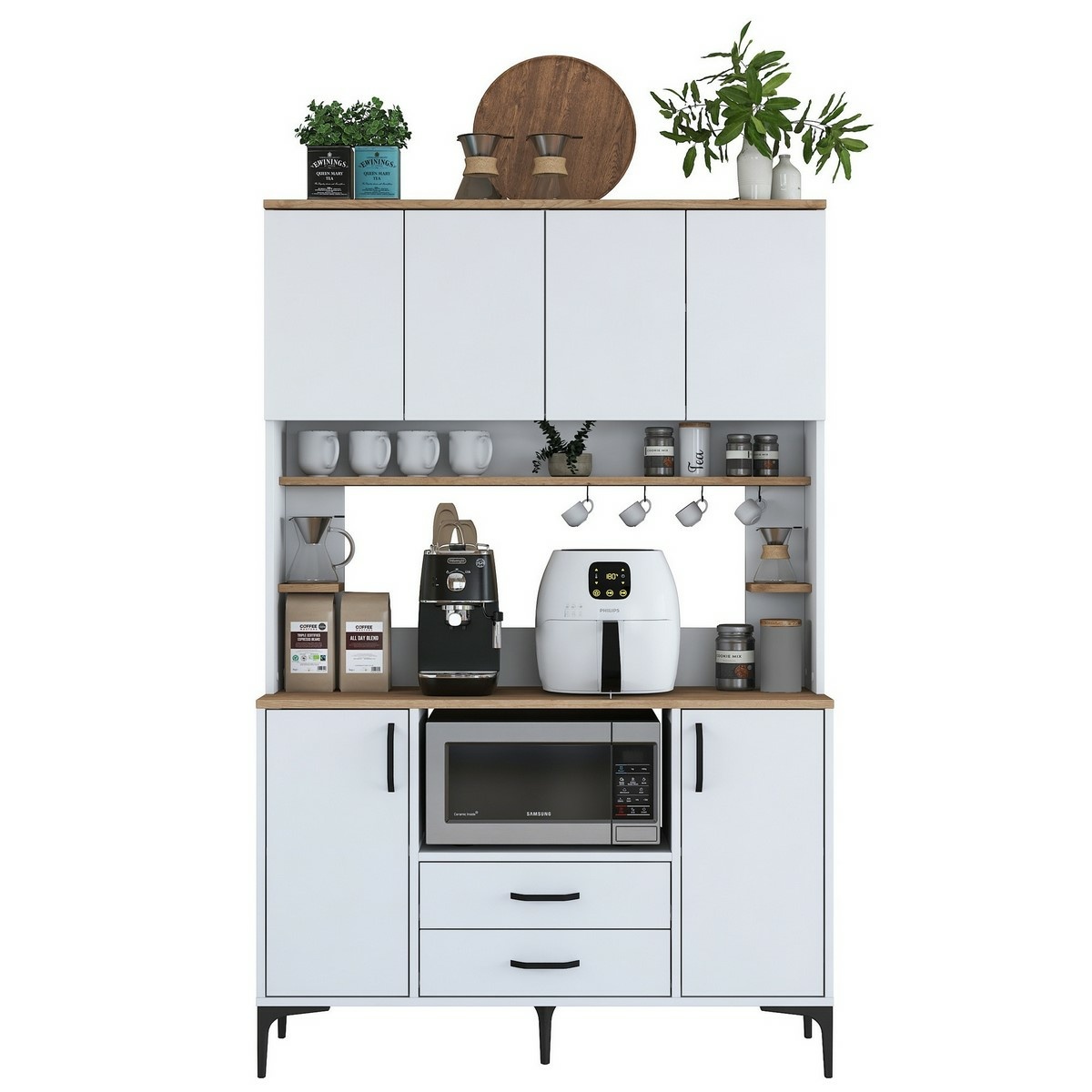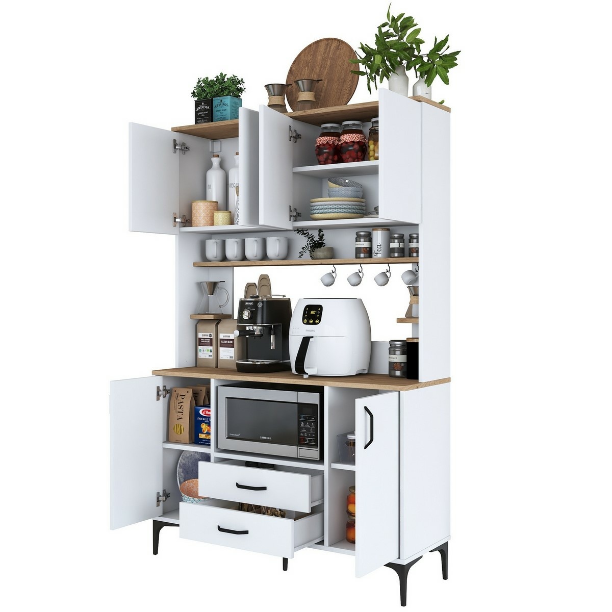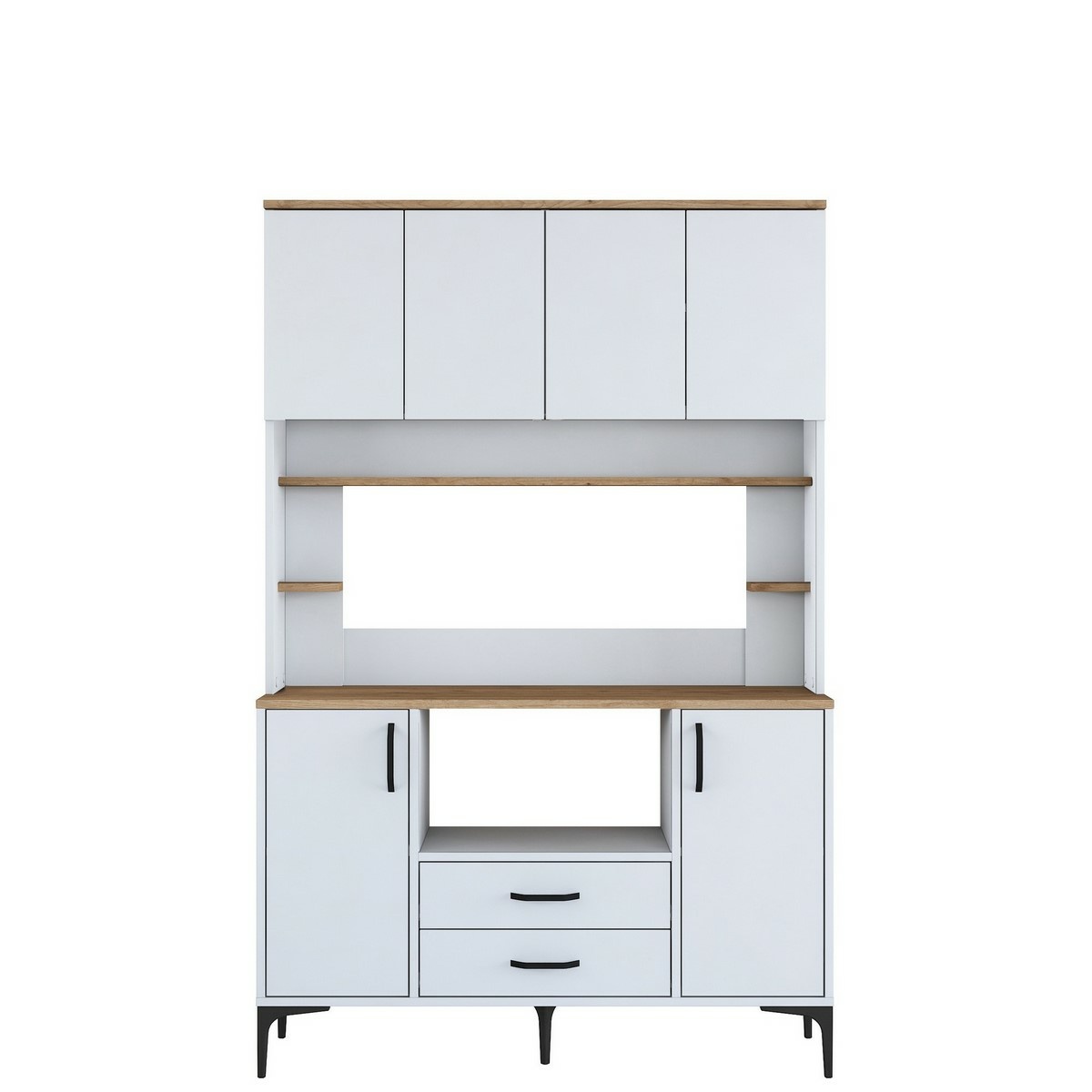 Skříň Jedy Walnut and White je praktický a elegantní kus nábytku, který vytvoří dokonale organizovaný kávový nebo kuchyňský koutek. Kombinuje horní uzavřené skříňky, otevřené police pro hrnky a doplňky, střední plochu pro spotřebiče a spodní úložnou část se zásuvkami a skříňkami. Nabízí tak maximální variabilitu a pohodlné uspořádání všech kuchyňských potřeb na jednom místě.Korpus je vyroben z melaminované dřevotřískové desky E1 o tloušťce 18 mm, která zajišťuje stabilitu, odolnost a snadnou údržbu. Kombinace ořechového dekoru a bílé barvy působí moderně, čistě a útulně, takže skříň snadno zapadne do různých interiérů. Pro vyšší bezpečnost ji lze také připevnit ke stěně.Parametry: materiál: 100% melaminovaná dřevotříska E1 tloušťka materiálu: 18 mm šířka: 120 cm výška: 184,2 cm hloubka: 40 cm barevné provedení: ořech + bílá horní skříňky, otevřené police, prostor pro spotřebiče, zásuvka a spodní skříňky