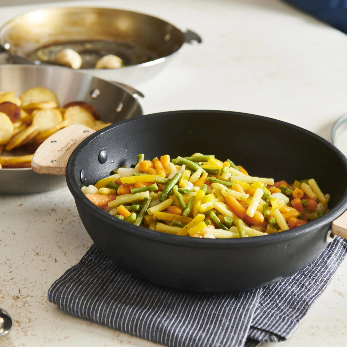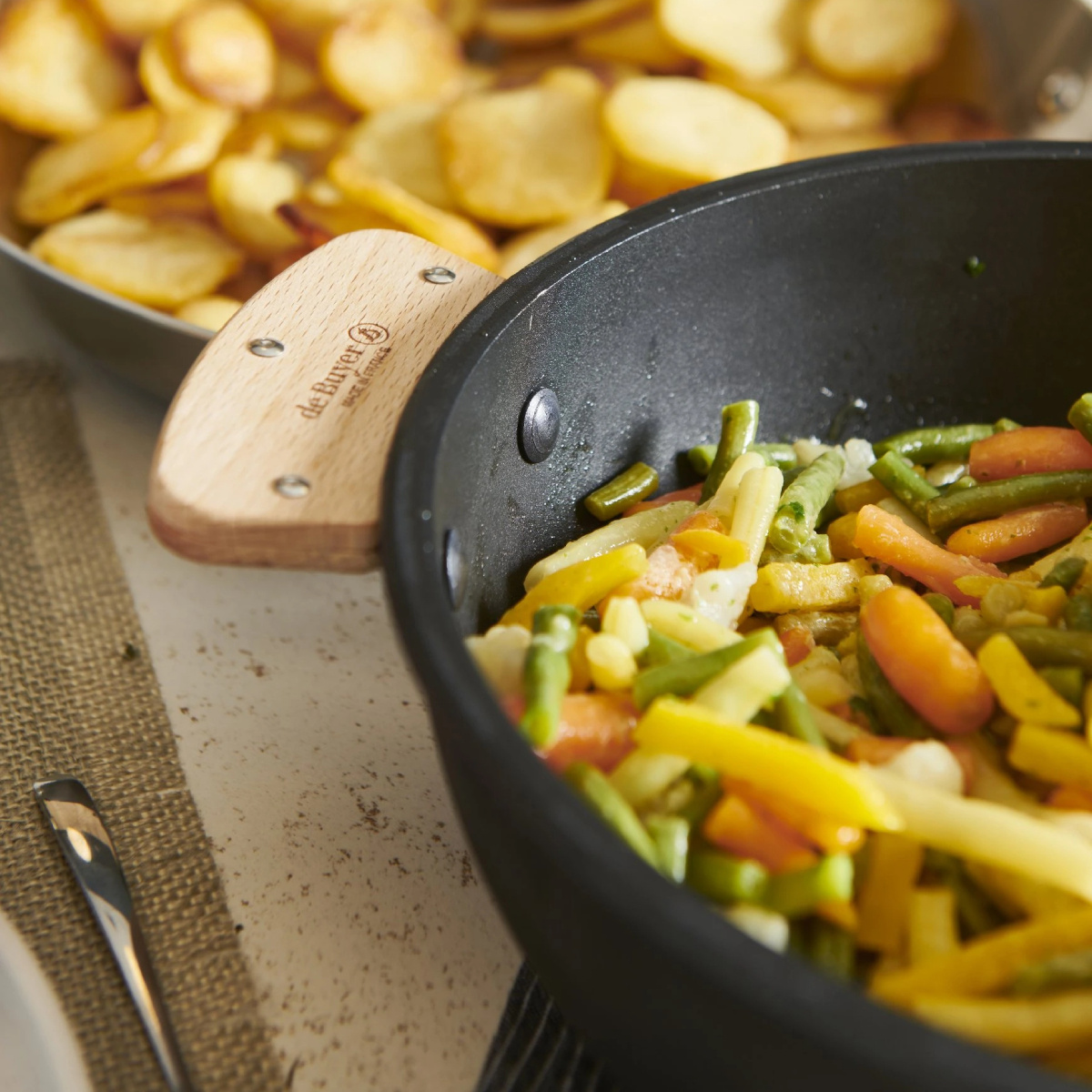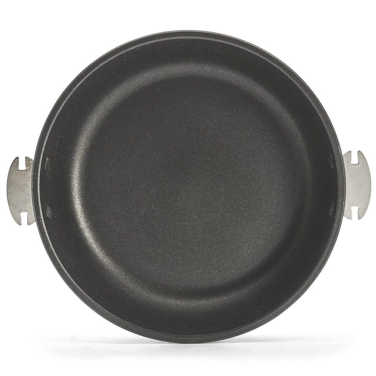 Pánev s nepřilnavým povrchem z kolekce CHOC EXTREME LOQY značky De Buyer je ideální pro jemné vaření nebo ohřívání. Zaoblená pánev zabraňuje kondenzaci a podporuje odpařování. Je ideální pro šetrné vaření ryb, zeleniny, luštěnin, obilovin a dalších. Výjimečná kluznost potahu dovoluje vaření s velmi malým množstvím tuku. Lze použít s odnímatelnou rukojetí LOQY nebo s dvojicí rukojetí LOQY z bukového dřeva. Zabírá velmi málo místa, LOQY vyjímatelné produkty lze stohovat. Rukojeti se prodávají samostatně. V naší nabídce je najdete pod číslem 134201 a 134202. Lze použít v troubě, můžete použít jako zapékací mísu bez držadla nebo držadel. Nezahřívejte prázdnou pánev, nepřehřívejte, vyhněte se teplotním šokům. Lze občas mýt v myčce na nádobí. Pro zachování povlaku však doporučujeme čištění horkou vodou, saponátem na nádobí a měkkou houbičkou. Vlastnosti: tělo z litého hliníku extra dlouhotrvající odolný nátěr 2 pevně nýtované nerezové základny kompatibilní s indukcí rozměry: horní vnitřní průměr 28 cm, vnější průměr 29,65 cm, vnitřní výška 6,2 cm průměr pro indukci 18,6 cm tloušťka dna 7 mm made in France