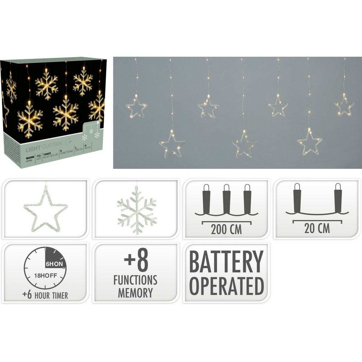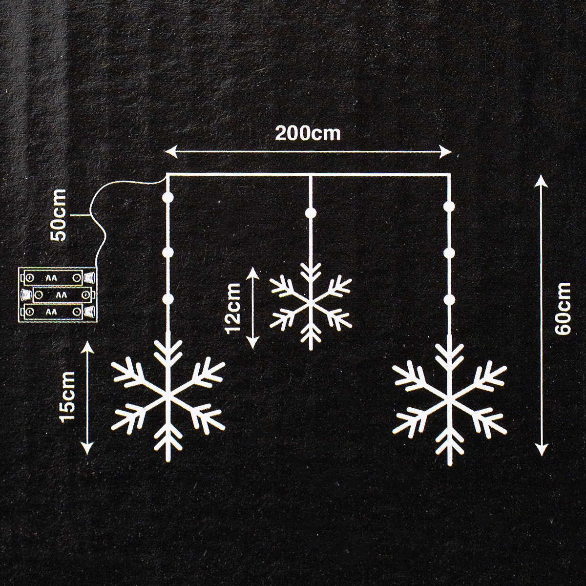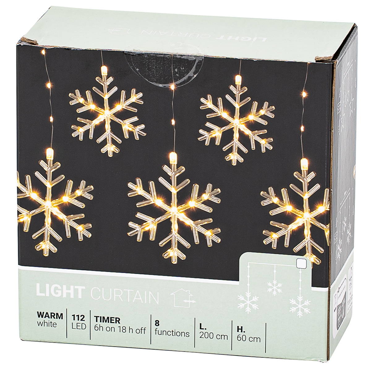 Světelný venkovní závěs Snowflakes, 200x60cm, LED, teplá bílá, časovač, 8 funkcí, na baterie, 200 cm