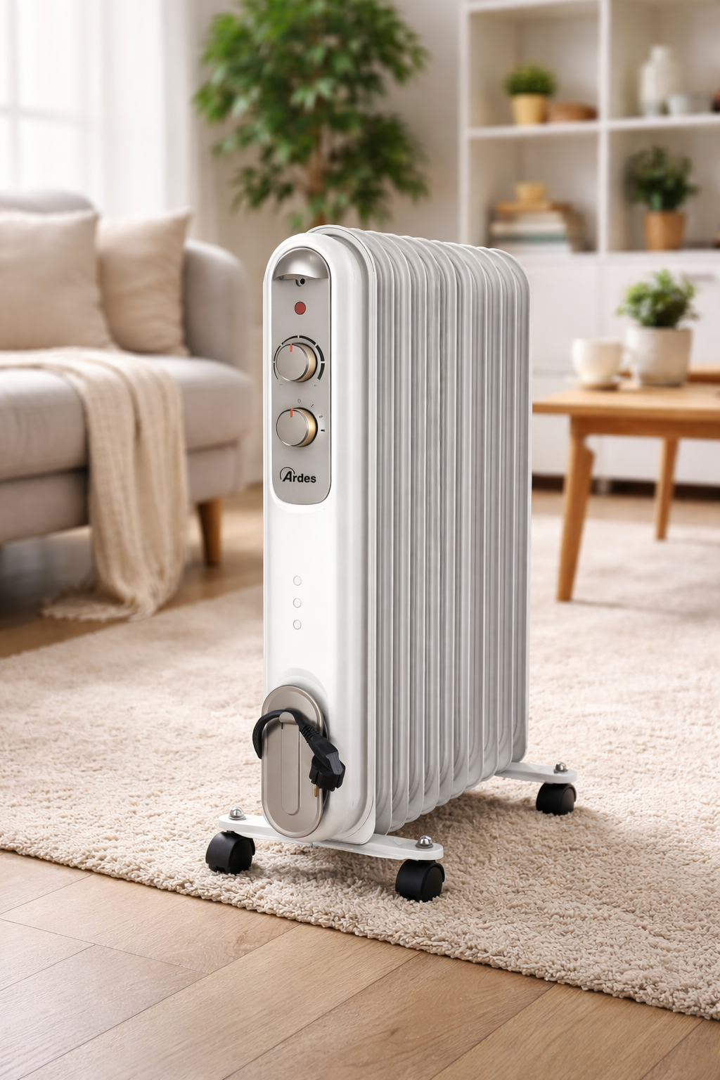 Olejový radiátor od výrobce Ardes má 11 topných žeber a speciální termické otvory pro efektivnější vytápění místností až do 75 m3. Má 3 výkonové stupně 1000 W, 1500 W, 2500 W. Přístroj též disponuje prostorovým termostatem s funkcí proti zamrznutí, kolečky a pohodlným držadlem pro snadný úchyt a manipulaci. Díky bezúdržbovému provozu v něm není potřeba měnit olej. Má vysokou akumulační schopnost, takže hřeje ještě dlouho po vypnutí z elektřiny. Tento přístroj je ideální i do ložnice nebo dětského pokoje, protože má zcela bezhlučný provoz.