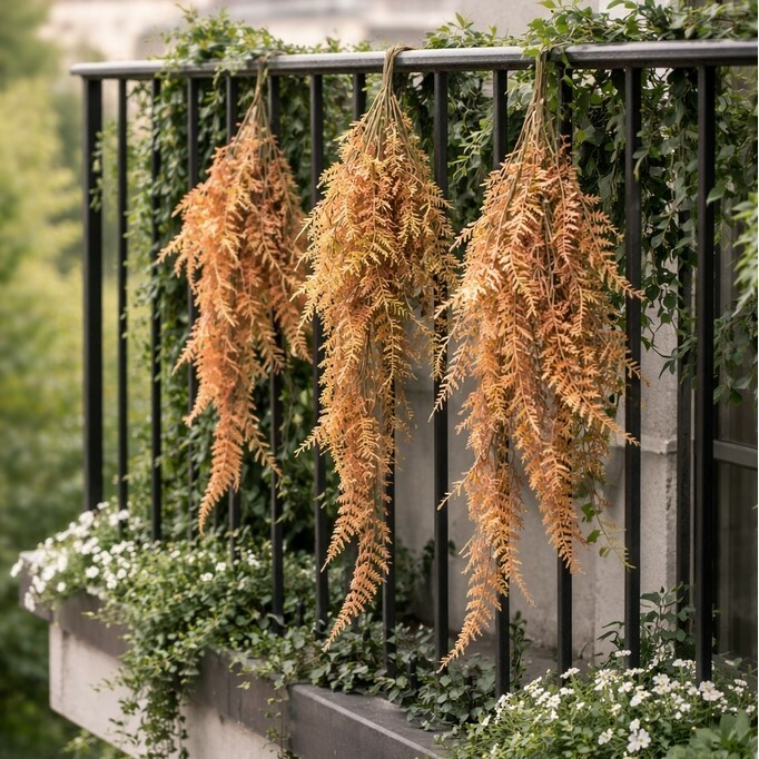 Hledáte možnosti, jak oživit interiér větvičkami a různými rostlinnými převisy a současně si přejete, aby vydržely co možná nejdéle? Jednoduchým řešením je pořízení umělého převisu, který splňuje všechna zmíněná očekávání. Konkrétně tato kopie převisu z kapradí v oranžovém dekoru je vysoce inspirativní variantou pro výzdobu. Naaranžovat jej můžete prakticky kamkoliv a obzvláště je perfektní pro vytvoření živoucí vertikální zahrady na vaší stěně či zábradlí. Při pohledu na převis nebudete chtít věřit tomu, že je umělý, a to díky detailnímu zpracování každé jeho části. Pohled na tuto dekoraci vám pomůže nasát kus přírodní harmonie, kterou si můžete natrvalo užívat přímo ve svém domě či jiném vybraném místě.
