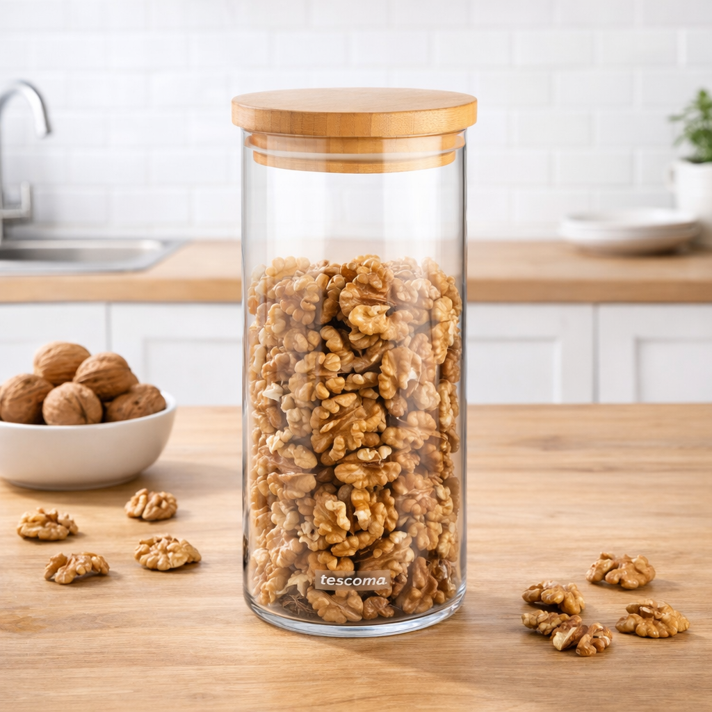 Kuchyňská dóza pro skladování potravin. Vyrobeno z odolného borosilikátového skla, uzávěr z prvotřídního bambusového dřeva. Opatřeno silikonovým těsněním. Skleněná dóza je vhodná do myčky, dřevěný uzávěr v myčce nemyjte, v případě potřeby otřete vlhkou utěrkou a osušte. 5 roků záruka.