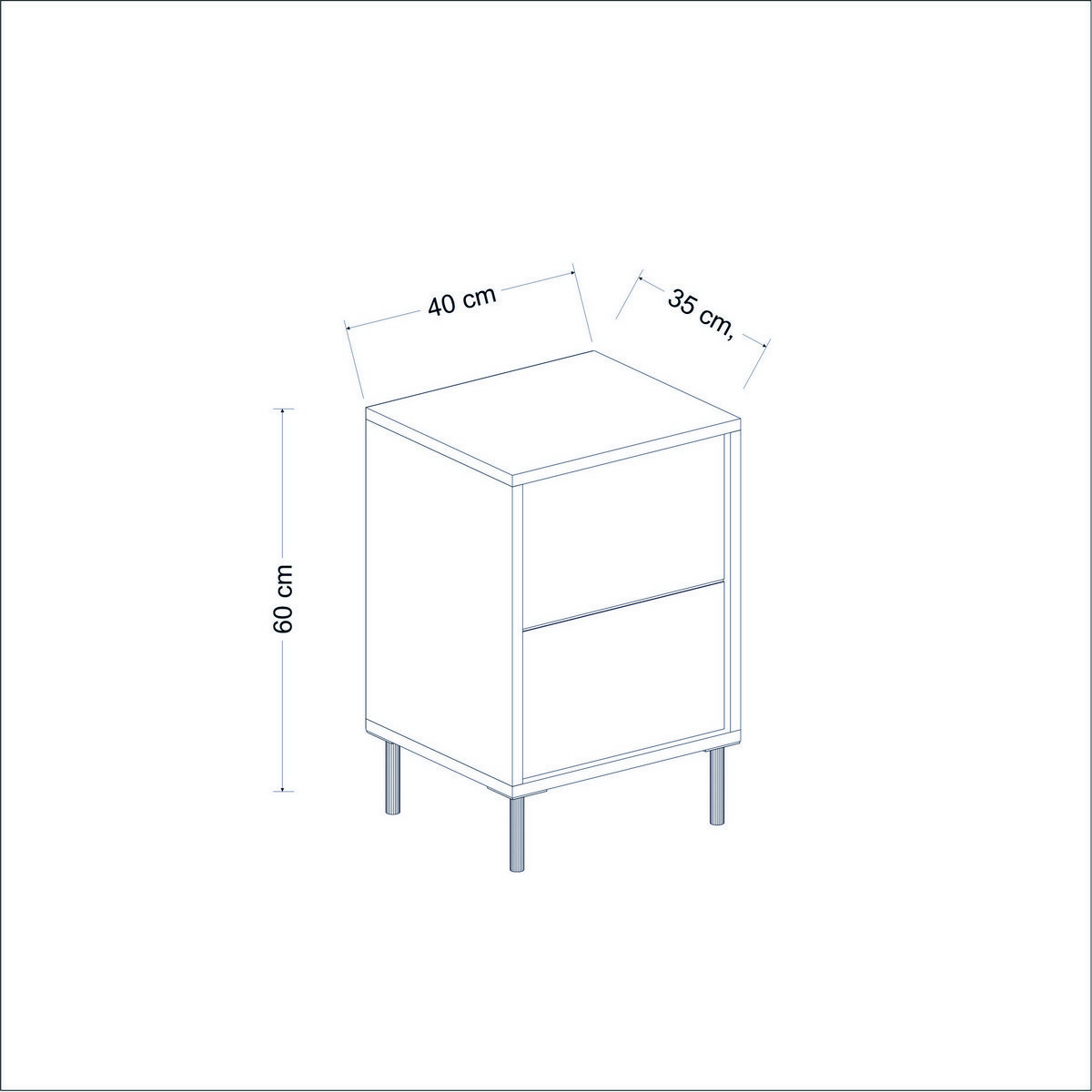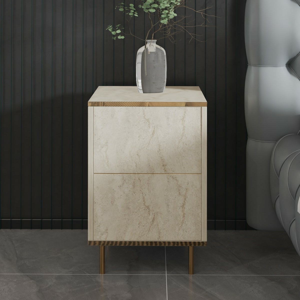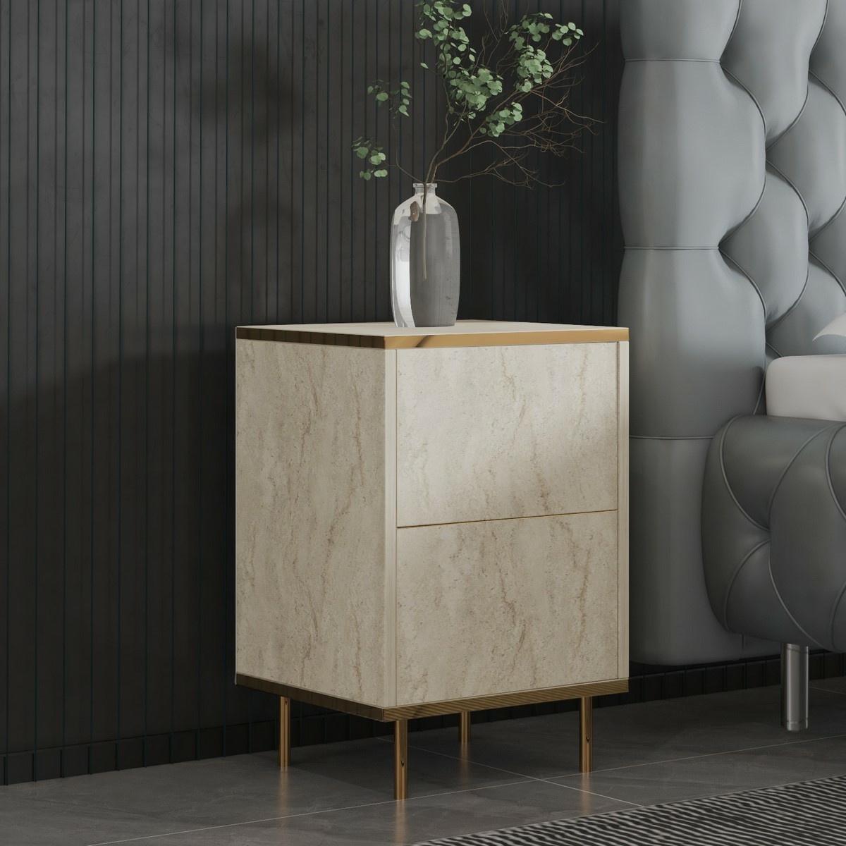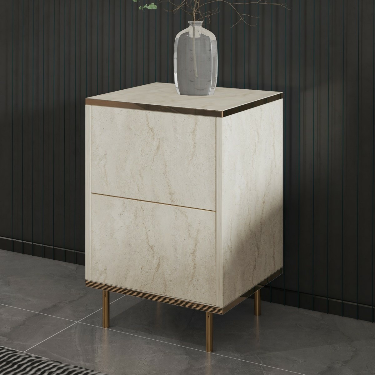 Noční stolek Imaj Travertine and Gold je výrazným designovým prvkem, který dodá ložnici luxusní a elegantní charakter. Kombinace dekoru travertin a zlatých detailů působí sofistikovaně a nadčasově, díky čemuž se stolek stane přirozenou dominantou prostoru.Korpus je vyroben ze 100% melaminem potažené dřevotřísky o tloušťce 18 mm, která zajišťuje pevnost a dlouhou životnost. Praktické otevřené police poskytují dostatek úložného prostoru pro knihy, dekorace i každodenní nezbytnosti. Důležité informace: materiál: melaminem potažená dřevotříska tloušťka materiálu: 18 mm rozměry: 40 × 35 × 60 cm barva/dekor: travertin a zlatá